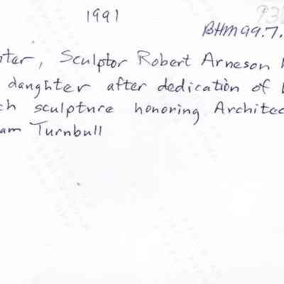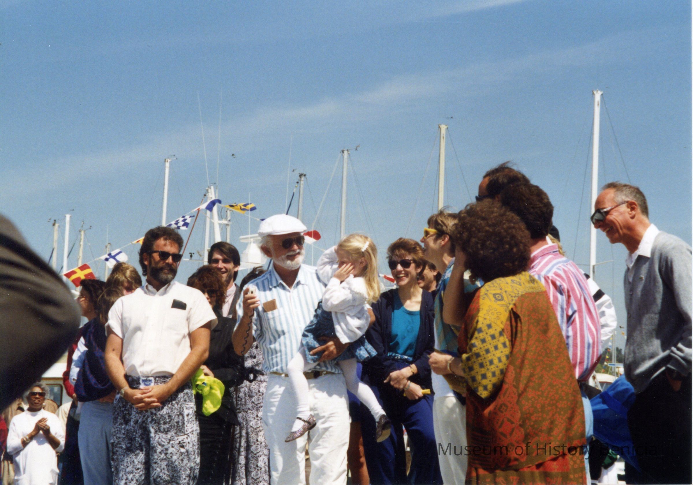 Color photo, written on back: "1991, center, sculptor Robert Arneson holding his daughter after dedication of his bench sculpture honoring architect, William Turnbull." A group of adults are on either side of Mr. Arneson. The location is near the opening of the Benicia Marina Basin.Collection