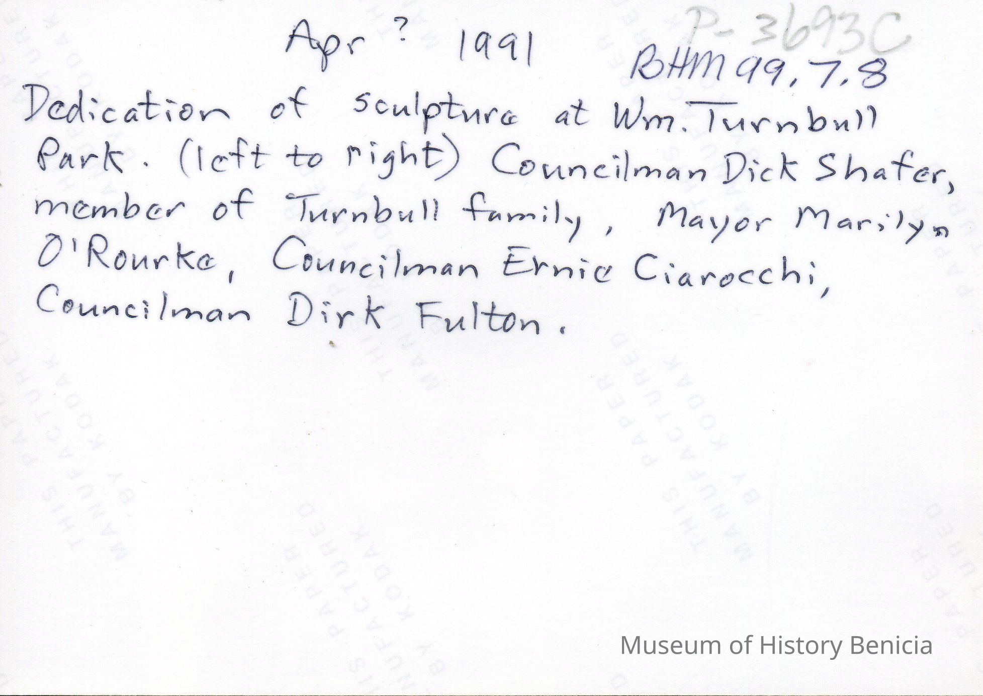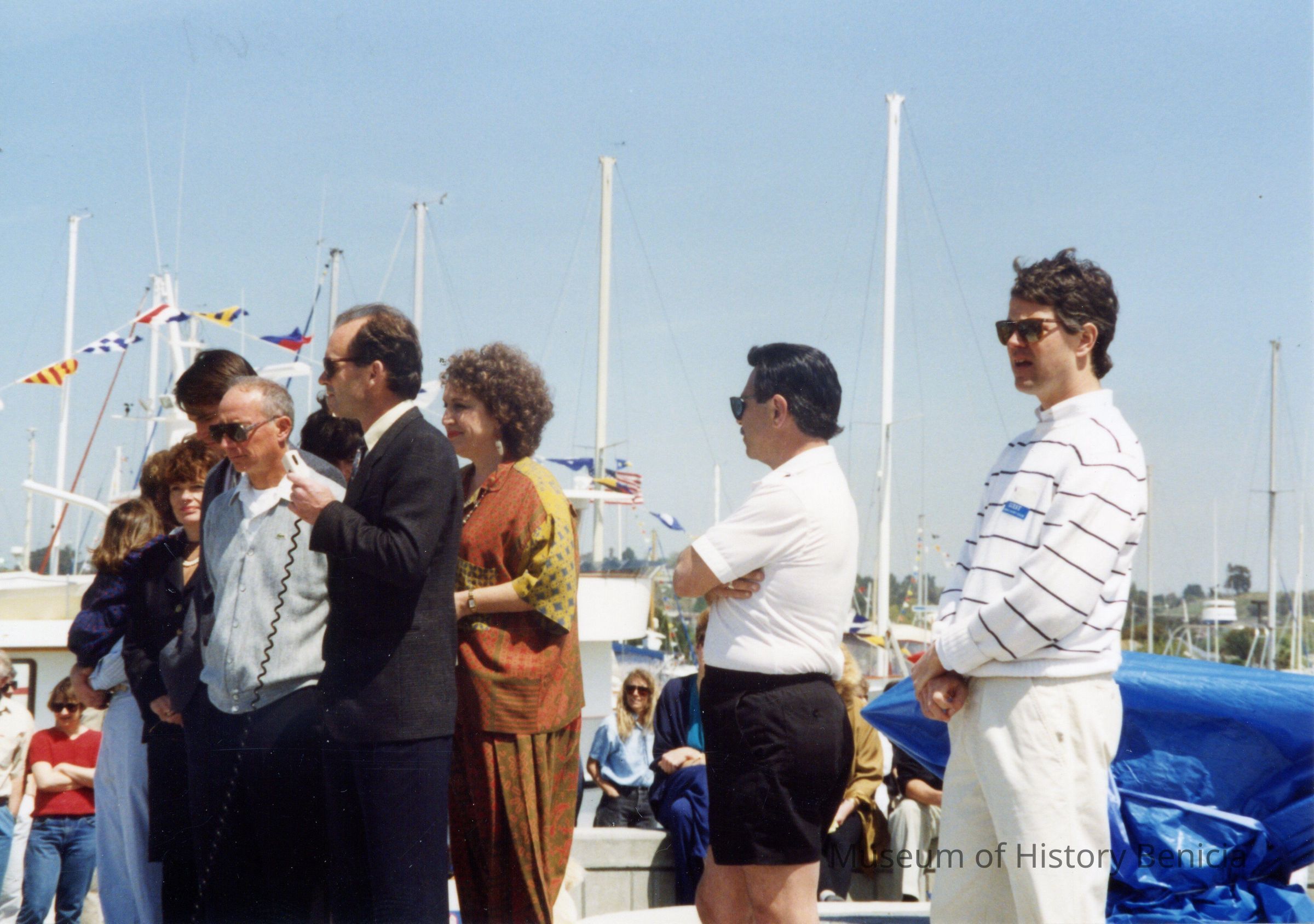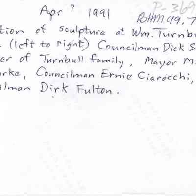 Color photo, written on back: "Dedication of sculpture at Wm. Turnbull Park (left to right) Councilman Dick Shafer, member of the Turnbull family, Mayor Marilyn O'Rourke, Councilman Ernie Ciarocchi, Councilman Dirk Fulton." Marina boats are in the background. The location is near the opening of the Benicia Marina Basin.Collection