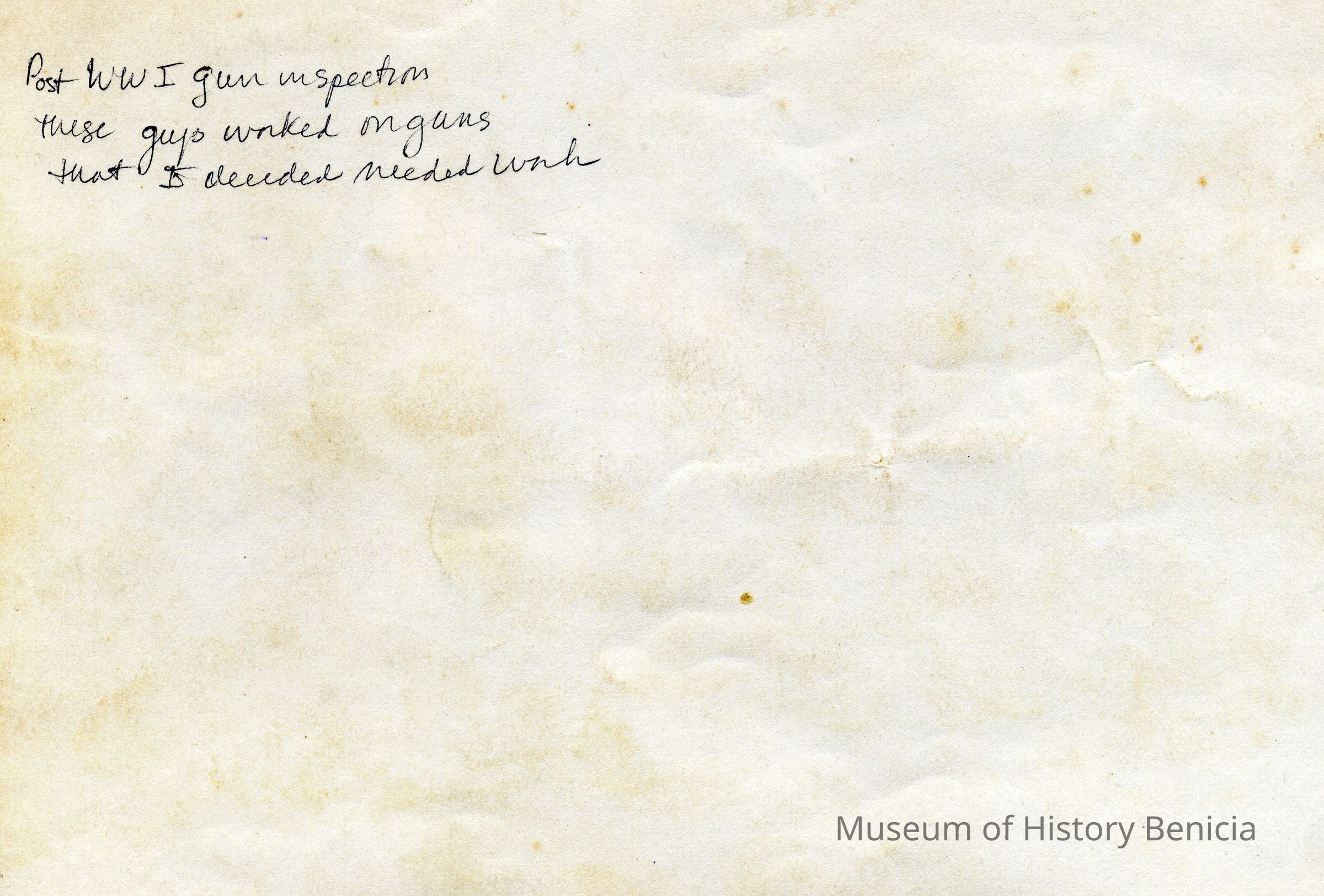 B/W Benicia Arsenal, Post W.W. I four men inspecting guns.