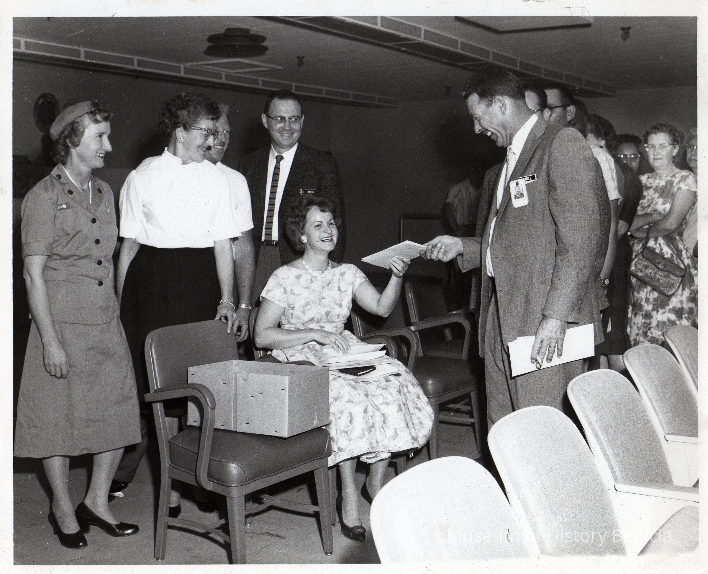 B/W A group of men and women. Four people are standing behind a woman who is passing out envelopes to men and women standing in line.Collection