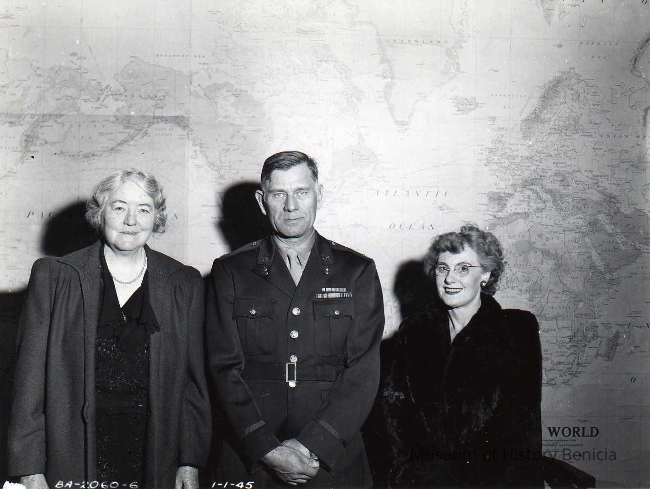 B/W Two Women and one man dressed in a military uniform. They are standing in front of a world map. At the bottom is written "BA 2026-6 1-1-45"Collection