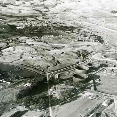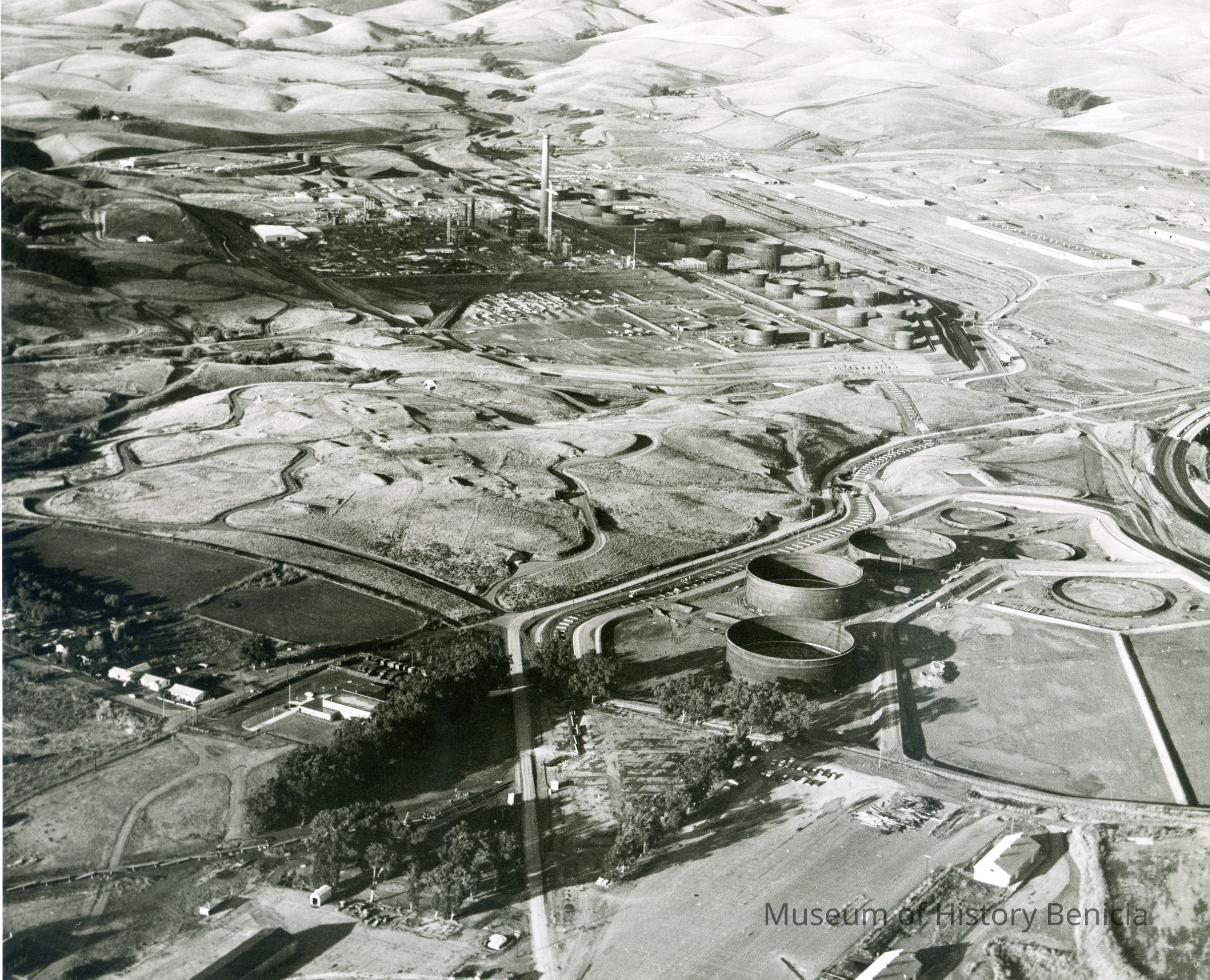 B/W aerial photo of construction of Humble Oil Refinery (later Exxon and Valero) looking north west; from top to bottom: empty hills, East Second Street, refinery equipment being assembled, tall smoke stack, rows of storage tanks and warehouses; graded areas and access roads, St. Dominic's cemetery, homes on Hillcrest Avenue, National Guard Armory, more storage tanks, other buildings and trees.Collection