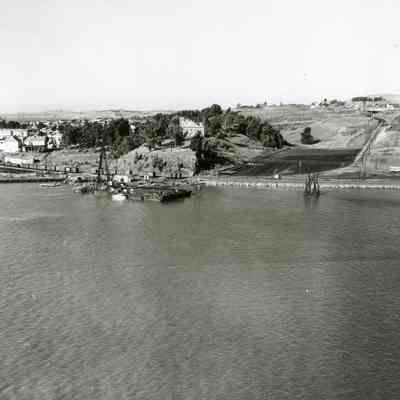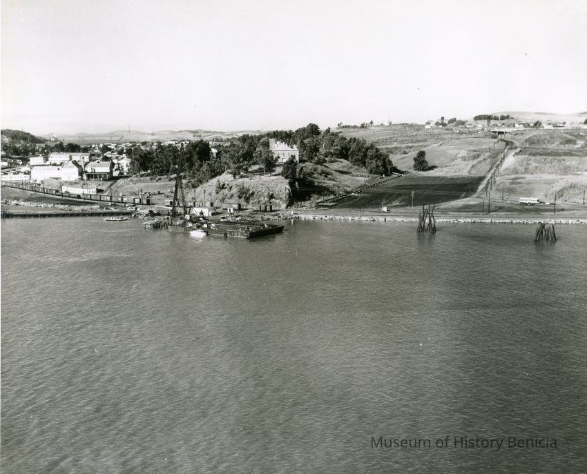 B/W aerial photo of Carquinez Strait shoreline south of the Benicia Martinez bridge; barge with drilling/pile driving equipment slightly left of center. The Clock Tower w/surrounding trees is seen slightly above center; railroad cars are parked on tracks along the water's edge. Undeveloped industrial sites are to the right.