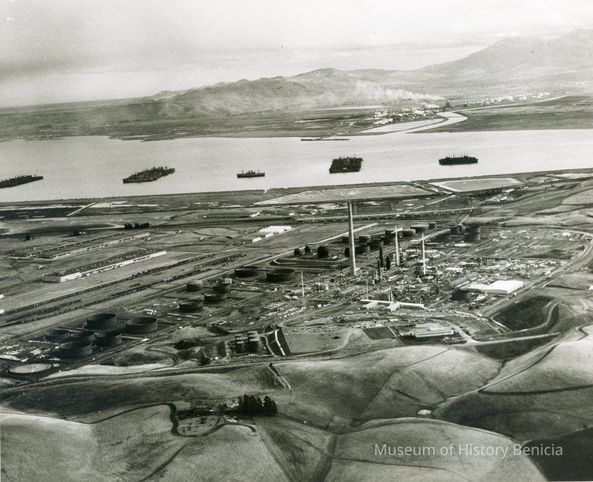 looking east: at top: small refinery on Contra Costa side of Straits, part of Mt. Diablo; just below top: Suisun Reserve/Mothball fleet (five groups of ships); center portion: warehouses, railroad cars on sidings, storage tanks, refinery equipment being assembled, storage buildings, vehicles; across below center: East Second Street and administration building; at bottom: small farm, empty fields.Collection