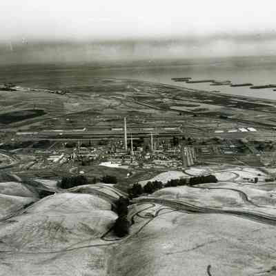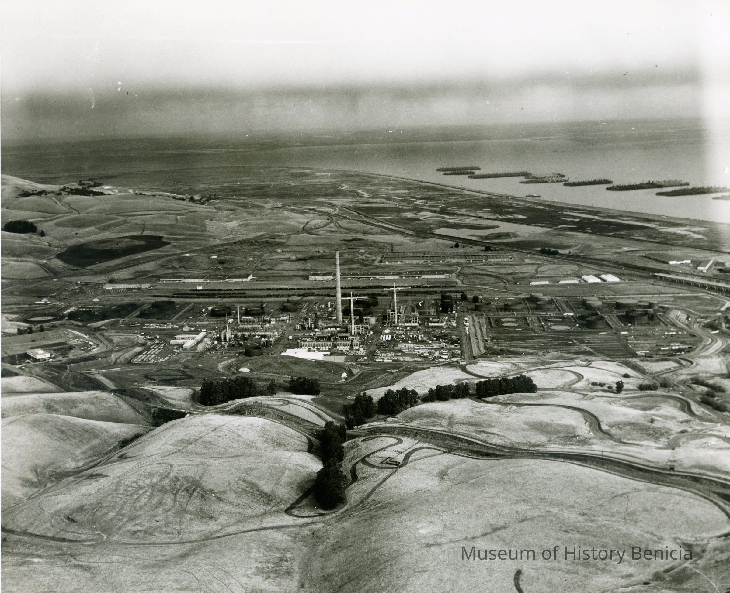 looking north east: at top: left: marshes, empty fields, right: Suisun Reserve/Mothball fleet (eight full groups and one partial group of ships are visible); across center: administration building on East Second Street, storage tanks, vehicles, other buildings, refinery equipment, smoke stack, other towers, warehouses, railroad cars on sidings, Hiway 680; across bottom: empty fields, East Second Street, rows of trees.Collection