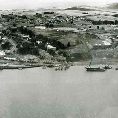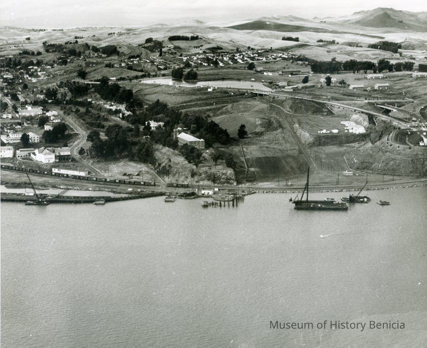 B/W aerial photo of pier construction Healy Tibbitts Construction Company on shore of Carquinez Strait south of Benicia/Martinez bridge; barges with pile driver and cranes near shore, railroad cars on tracks near the water's edge; across center: old arsenal buildings, officer's row, Clock Tower, graded industrial areas, Pine Lake, more old arsenal buildings including Camel Barn Complex; above center: Viewmont and Highlands residential areas; at top: empty hills, Vallejo buildings and Napa River (?) in the distance.Collection