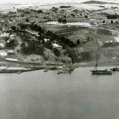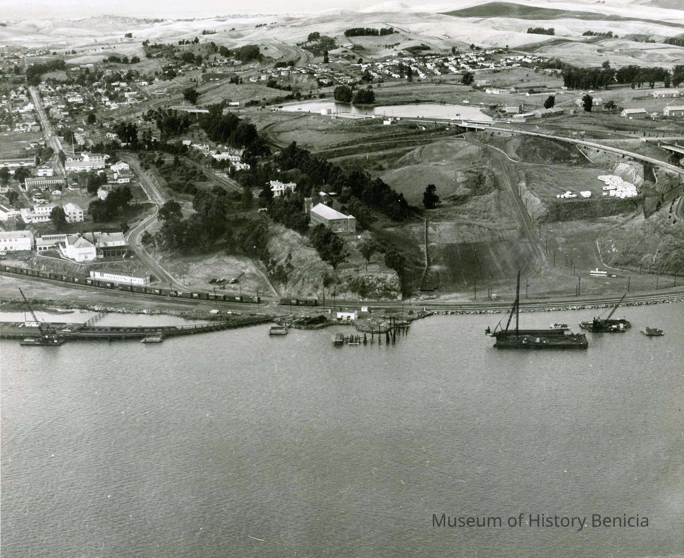 B/W aerial photo of pier/dock site south of Benicia/Martinez bridge along the shore of Carquinez Straits; very similar to BHM99.11.395; in the photo you can see: old arsenal buildings including the Clock Tower, officer's row, the Camel Barn Complex and Pine Lake.