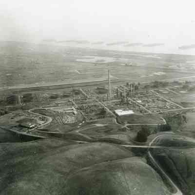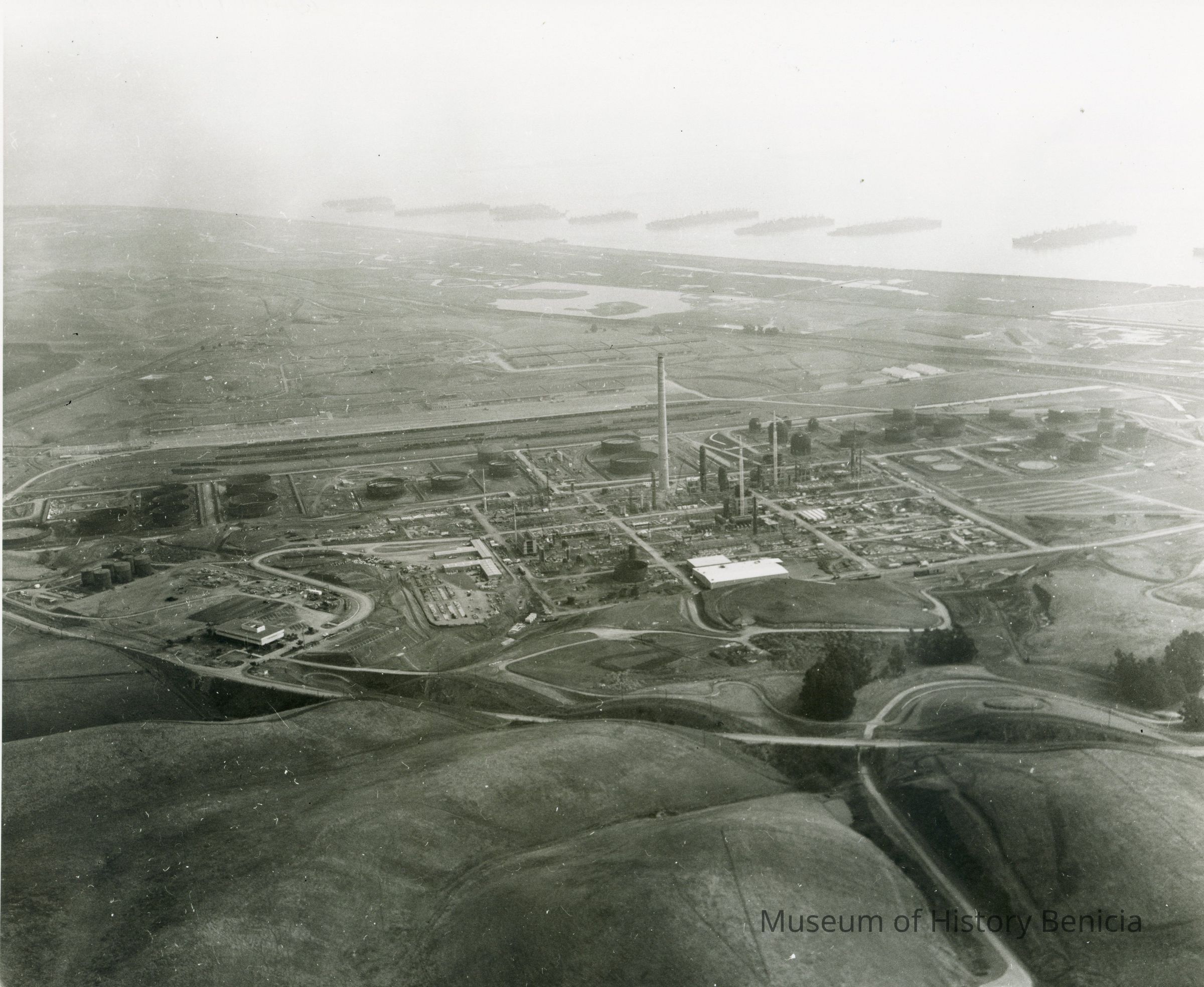 looking north east: across bottom: East Second Street and empty fields; across center: administration building, storage tanks, and refining equipment being assembled, along with other buildings; across top: warehouses, hiway 680, Suisun Reserve/Mothball Fleet (eight full groups and one partial are visible)Collection