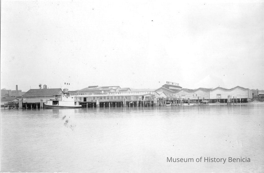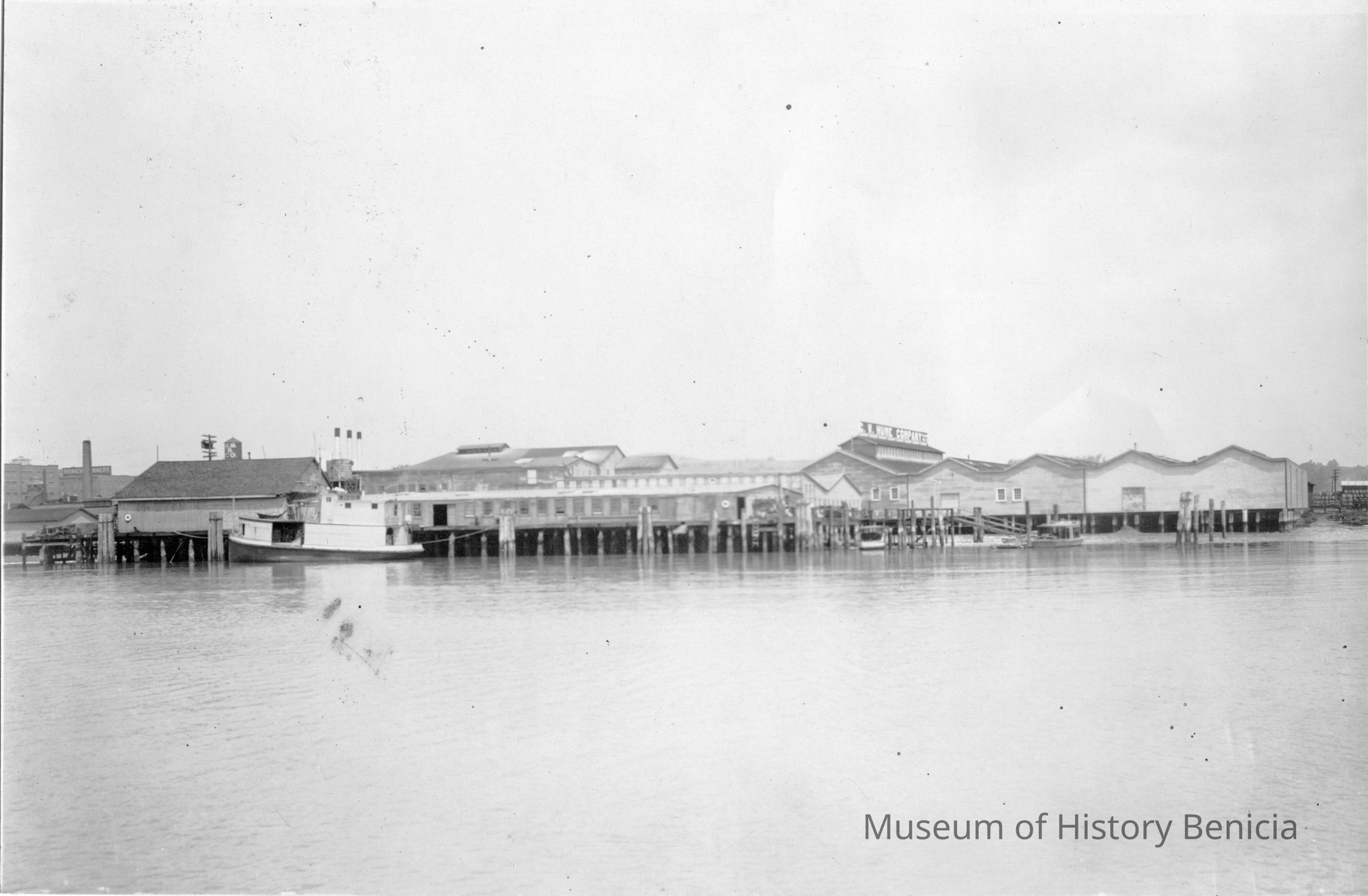 B/W photograph of G W Hume Cannery on the Benicia waterfront. Photo was taken from the water.