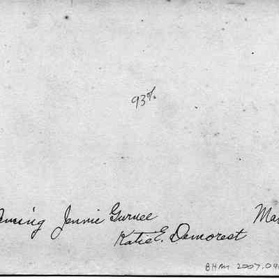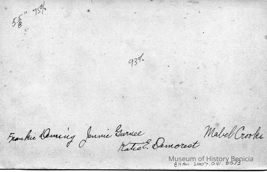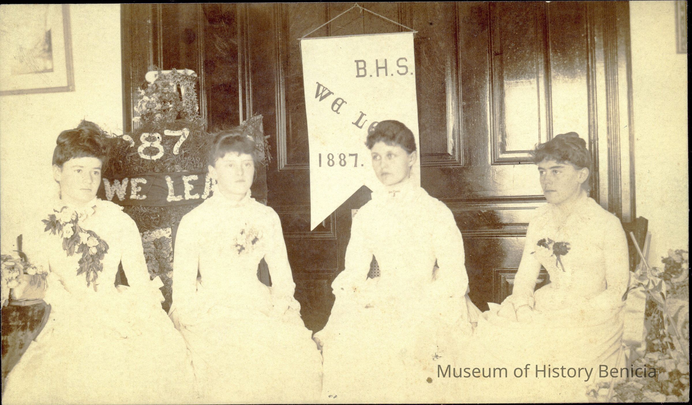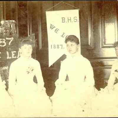 B&W image of a group of women. In the background it says "B.H.S. We Lea..." 1887." Not sure what the full saying was meant to be. Could be "We Lead" (just a guess). On the back of ther photo are the names of the women: