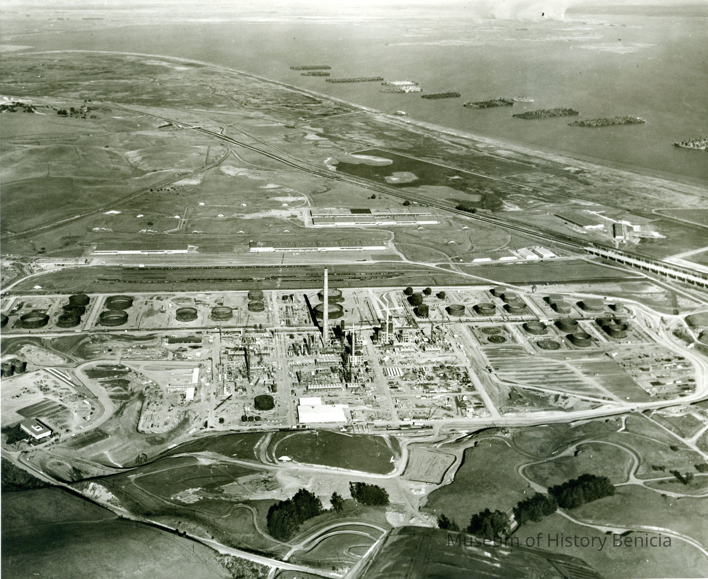 looking north east: across bottom: administration building, East Second Street, access roads and airplane wing tip; across center: storage tanks, refining equipment being assembled, tall smoke stack, towers, cranes, railroad cars on sidings, warehouses, storage buildings, hiway 680; across top: marshes, Suisun Reserve/Mothball Fleet (ten groups of ships),;