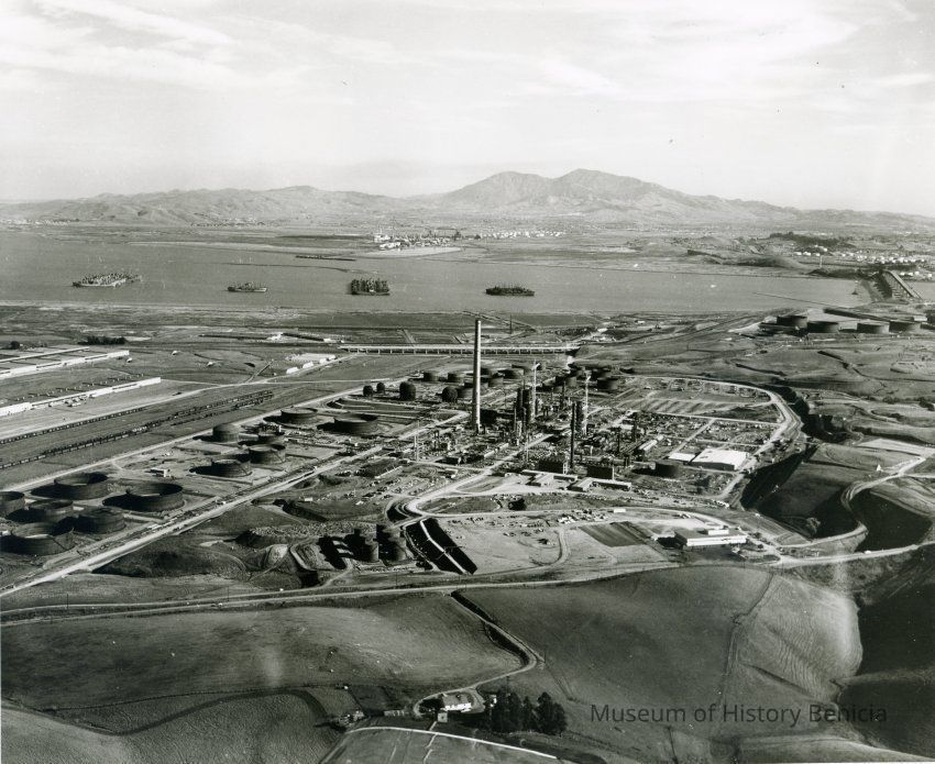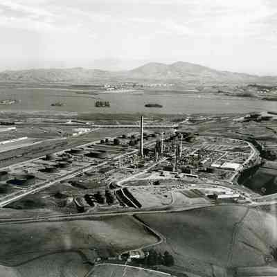 looking east: across bottom: empty fields, small farm, airplane wing tip, East Second Street, administration building; across center: warehouses, railroad cars on sidings, storage tanks, tall smoke stack, refinery equipment being assembled, towers and crane; across above center: Suisun Reserve/Mothball Fleet (four groups of ships) hiway 680 and SP Railroad and Benicia/Martinez bridges; across top: Contra Costa County, marshes, small refinery, Mt. Diablo, Shell Refinery, high clouds in sky.Collection