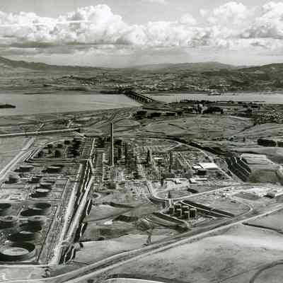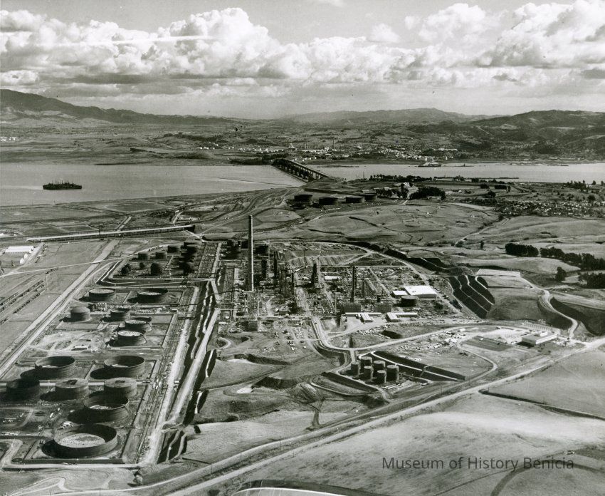 looking east south east: across top: one group of ships in Suisun Reserve/Mothball Fleet, Shell Oil Refinery, SP Railroad and Benicia/Martinez bridges, City of Martinez, far east side City of Benicia; across lower area: storage buildings, railroad cars on sidings, storage tanks in various stages of completion, large smoke stack (in center) refinery equipment being assembled, terraced hillside, empty fields, administration building on East Second Street.Collection