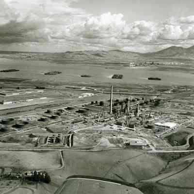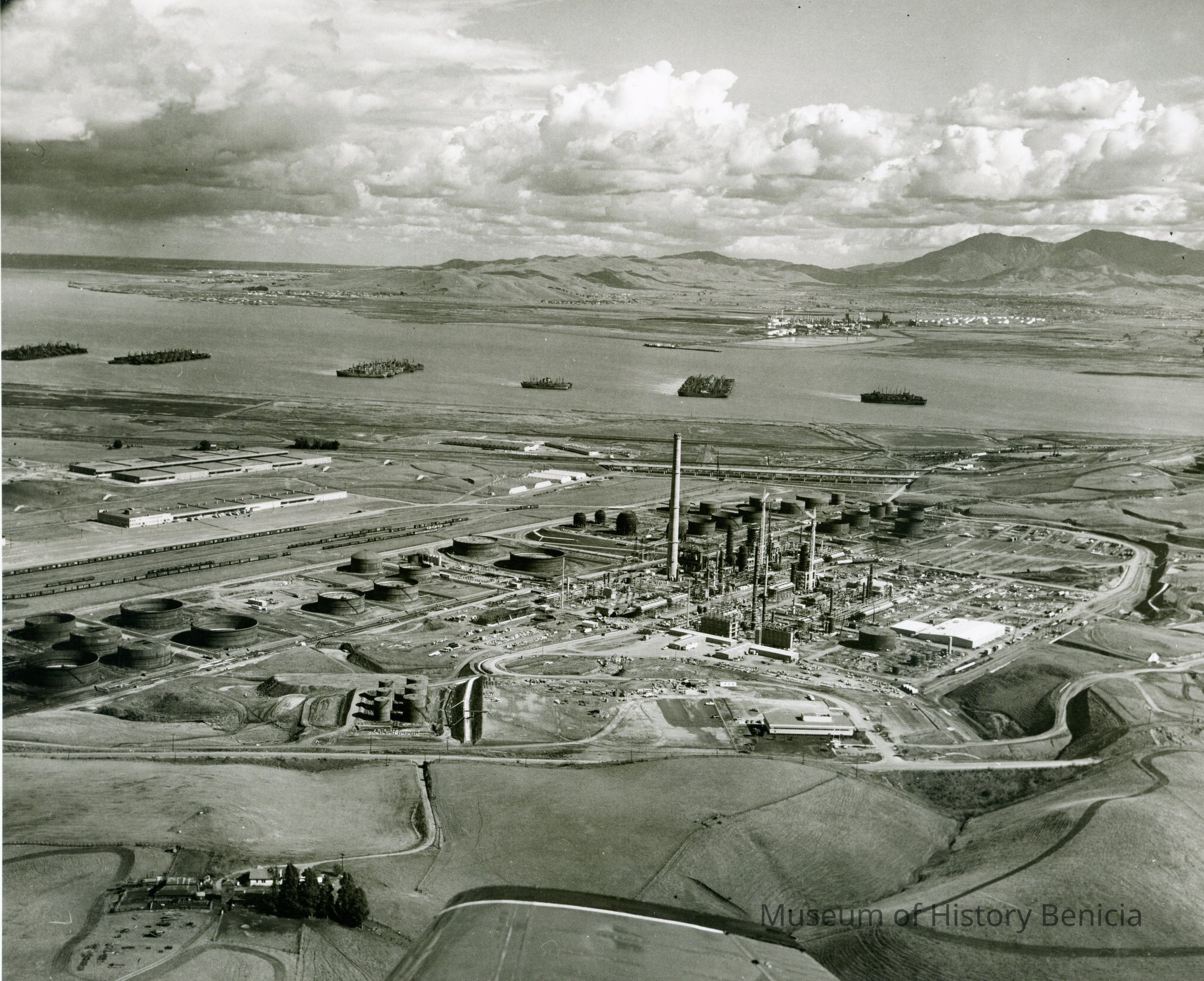 looking east: across bottom: small farm w/trees and buildings, empty fields, airplane wing tip; across center: warehouses, railroad cars on sidings, storage tanks, refinery equipment including tall smoke stack, towers, cranes, storage buildings, pipe lines; across above center: Suisun Reserve/Mothball Fleet (six groups of ships); across top: Contra Costa County, marshes, small refinery, Mt. Diablo, cloudy skies.Collection