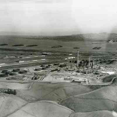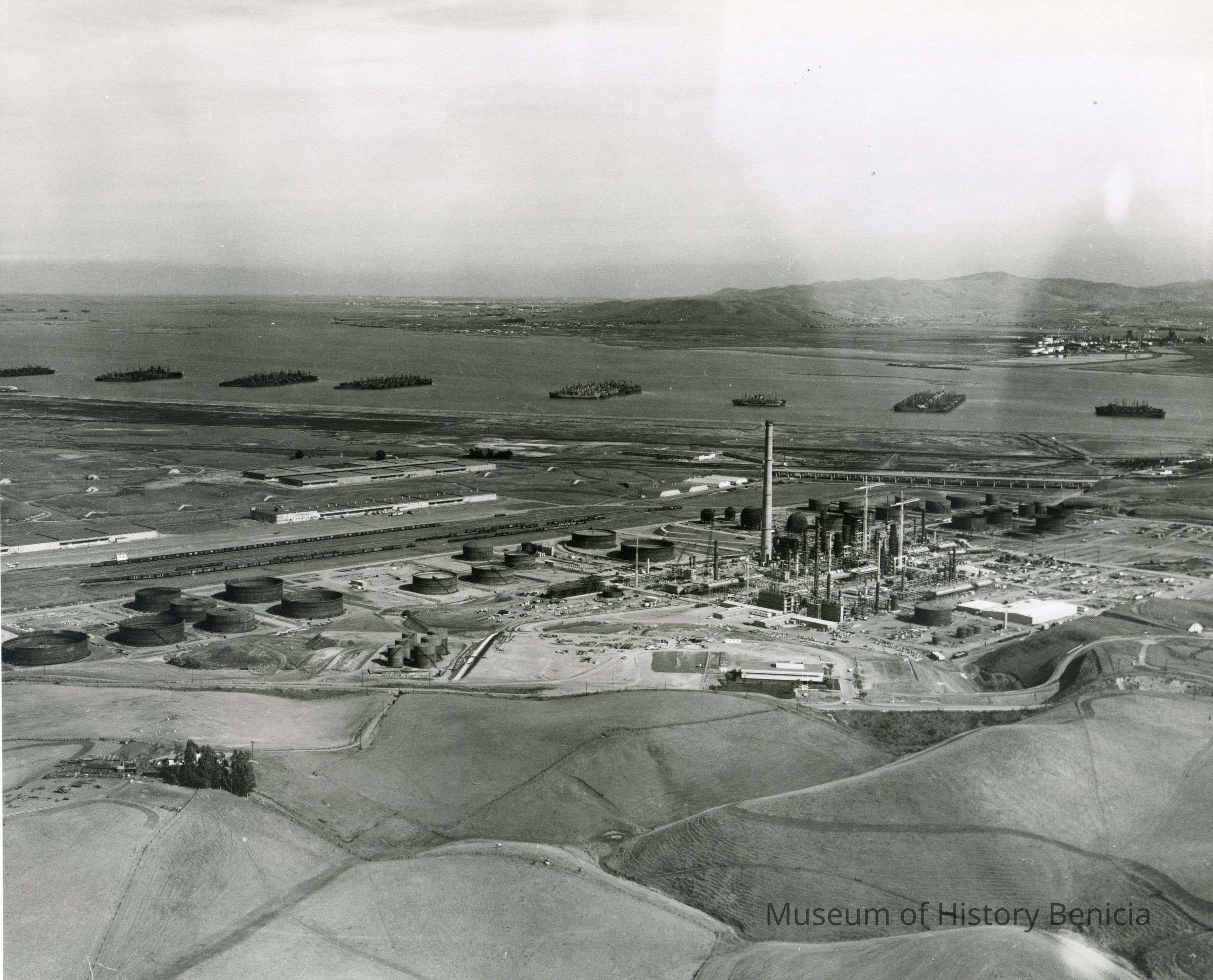 looking north east: across top: Contra Costa County marshes, Suisun Reserve/Mothball Fleet (eight groups of ships), small refinery near Martinez; across center: warehouses, railroad cars on sidings, storage tanks under construction, refinery equipment being assembled, tall smoke stack, two cranes, towers, hiway 680; across bottom: East Second Street, small farm w/buildings, vehicles and trees, empty fields.Collection