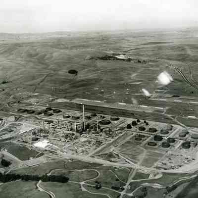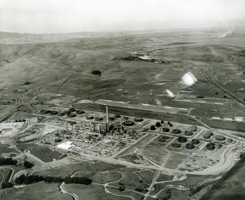 looking north: across the top: empty hills, Cordelia and Suisun in distance; also a marsh fire is visible at far right; across lower portion of photo: East Second Street, storage tanks in various stages of construction, refinery equipment being assembled, large smoke stack (in center), warehouses, railroad cars on sidings, in-ground bunkers, rows of trees, access roads, airplane wing tip far right lower corner.Collection