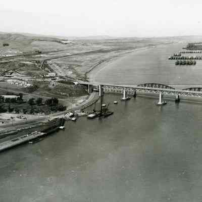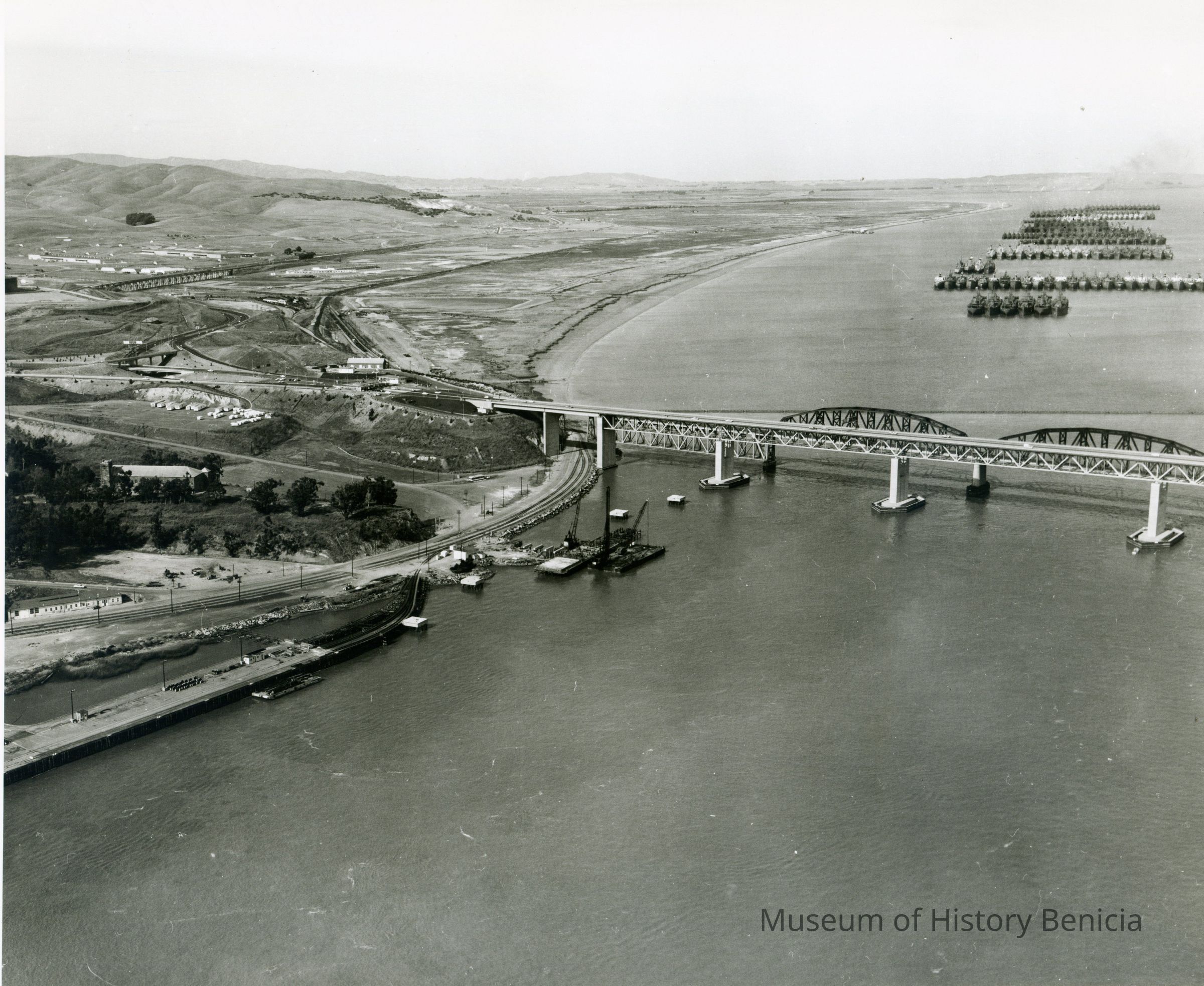 B/W aerial photo construction of pier/dock on Carquinez Strait shoreline south of Benicia/ Martinez bridge; looking north across photo: old wharf/pier, Clock Tower, storage buildings, mooring stations, construction equipment (cranes and pile driver), bridge toll plaza, hiway 780 and 680 interchange, Benicia/Martinez and SP Railroad bridges, marshes, Suisun Reserve/Mothball Fleet (ten groups of ships).