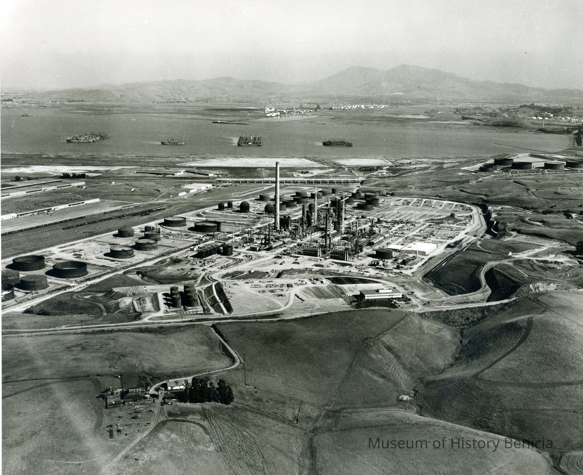 looking east: across the top: Suisun Reserve/Mothball Fleet (four groups of ships), small oil refinery, Mt. Diablo, Shell Oil Refinery;