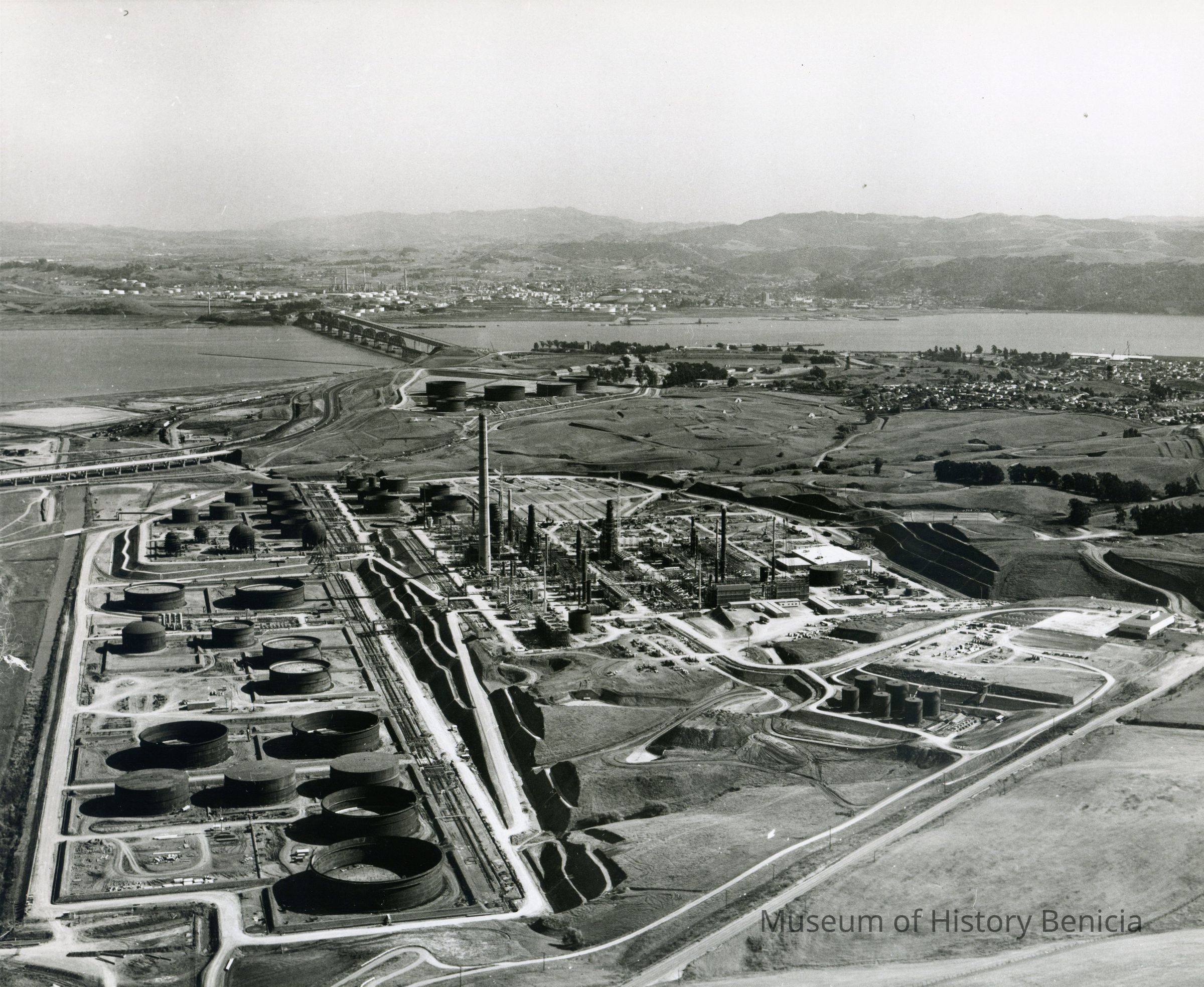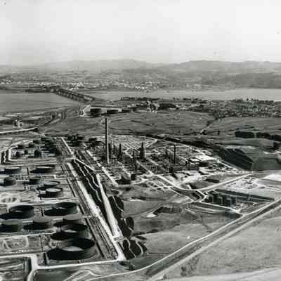 looking south east: in foreground: East Second Street; across center: storage tanks (mostly complete) refining equipment under construction, tall smoke stack (in center), terraced hillside, administration building; across top: hiway 680, SP Railroad and Benicia/Martinez bridges, Shell Oil Refinery, City of Martinez, Contra Costa County Hills.Collection