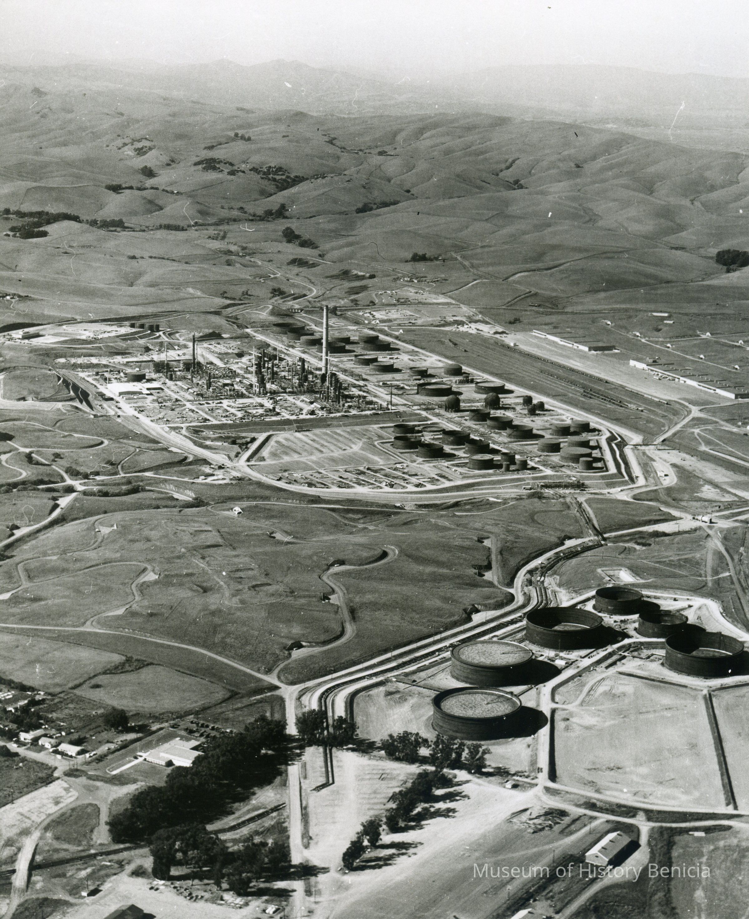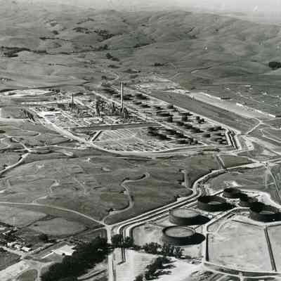 looking north west: across top: empty, rolling hills speckled with trees; across center: refinery equipment being assembled, tall smoke stack (in center), storage tanks, railroad cars on sidings, warehouses; across bottom: homes on Hillcrest Avenue, National Guard Armory, lines of trees, storage tanks and graded areas.Collection