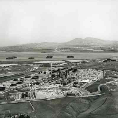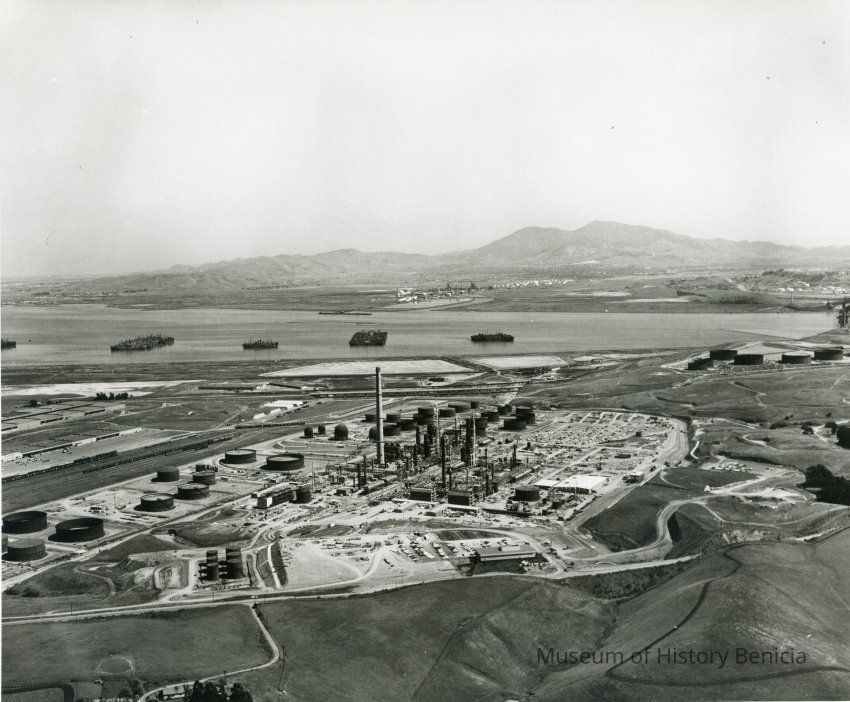 looking east: across top: four groups of ships in Suisun Reserve/Mothball Fleet, small refinery, Mt. Diablo; across middle: warehouses, railroad cars on sidings, storage tanks, tall smoke stack (in center), refining equipment, construction materials, workers' vehicles, in-ground bunker areas w/access roads, more storage tanks; across bottom: East Second Street, administration building, empty fields, access road to small farm.Collection