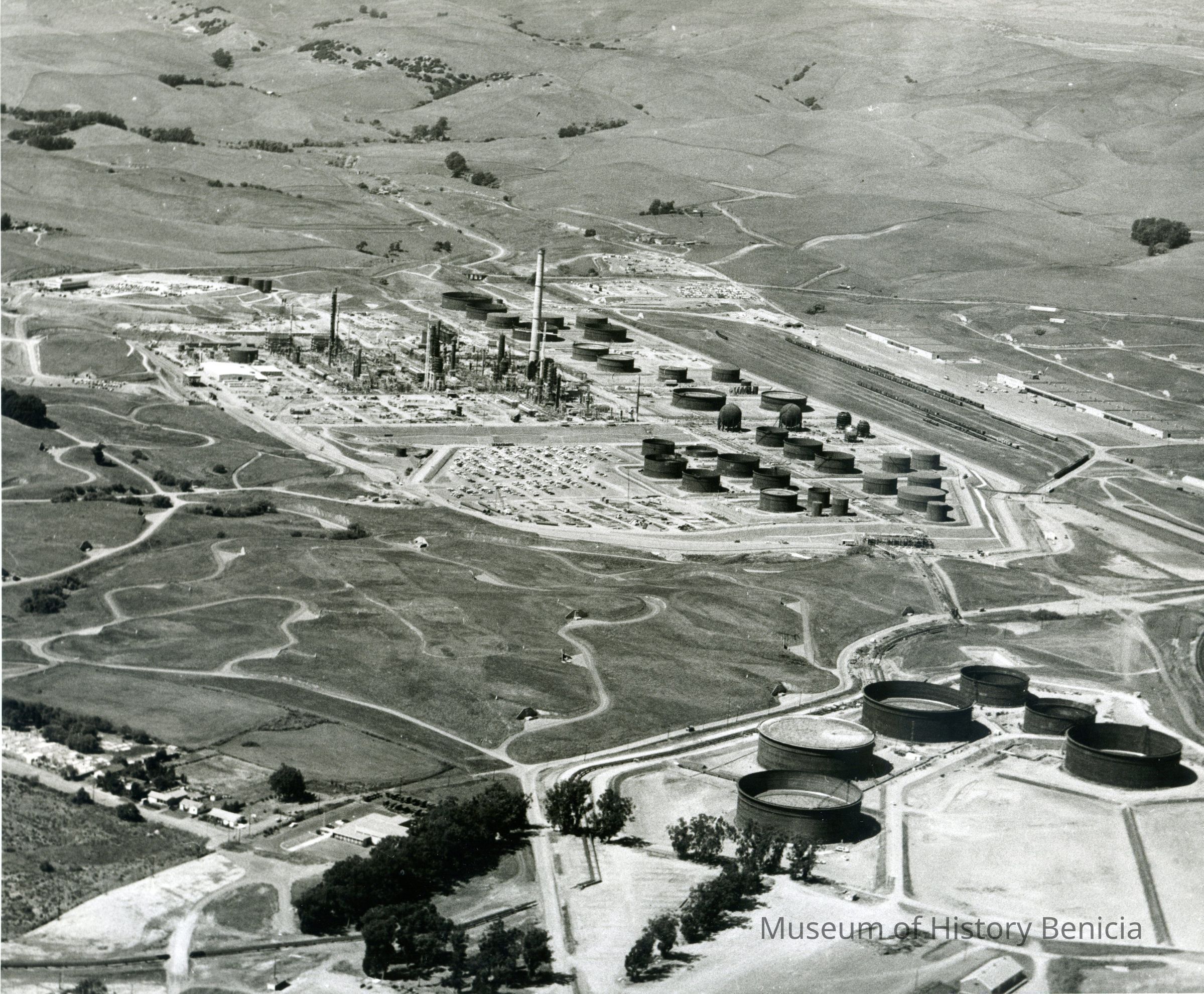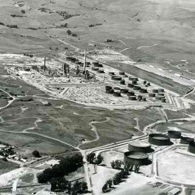 looking north west: across top: empty hills dotted with trees; across center: administration building on East Second Street, refinery equipment being assembled, towers, tall smoke stack (in center) workers' vehicles, storage tanks in various stages of construction; railroad cars on sidings, warehouses, in-ground bunkers; across bottom: houses on Hillcrest Avenue, National Guard Armory, rows of trees, six storage tanks in various stages of completion.Collection