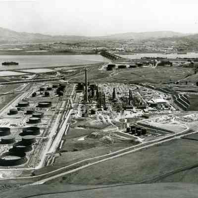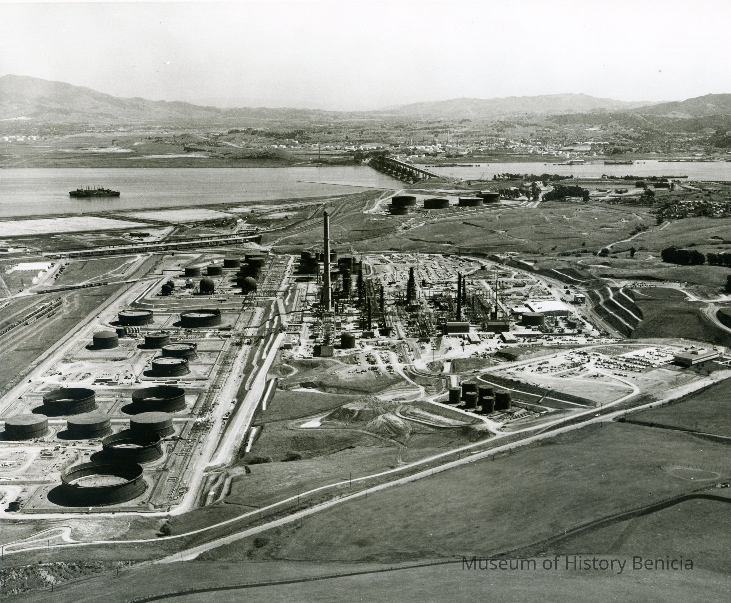 looking south east: across top: southside of Mt. Diablo, Shell Refinery, City of Martinez, one group of ships in Suisun Reserve/Mothball Fleet, SP Railroad and Benicia/Martinez bridges, group of five storage tanks, in-ground bunker areas w/access roads, far east side City of Benicia; across center: railroad cars on sidings, storage tanks, refining equipment area, tall smoke stack (in center), other towers (exhaust type?) small buildings, terraced hillside, administration building; across bottom: East Second Street, empty fields.Collection