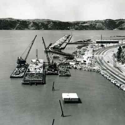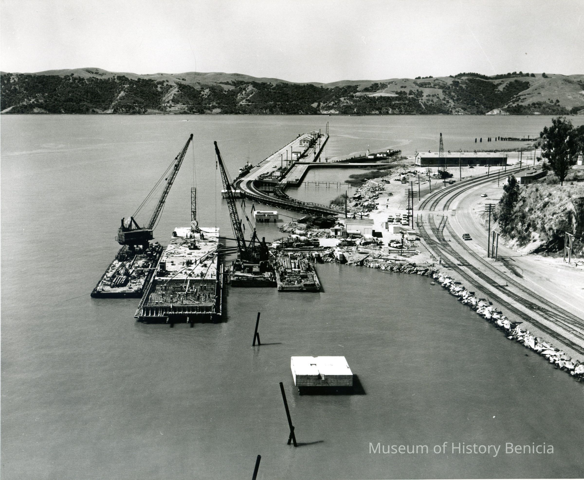 B/W aerial photo of dock/pier construction on Carquinez Strait shoreline south of Benicia/ Martinez bridge; looking south: completed pipeline supports stations in foreground; in center: dock with concrete being poured, cranes and concrete houses are visible along with trucks, old wharf, railroad tracks, storage building; Contra Costa County hills south of the strait are visible at the top of the photo.