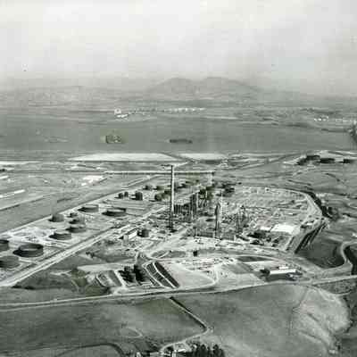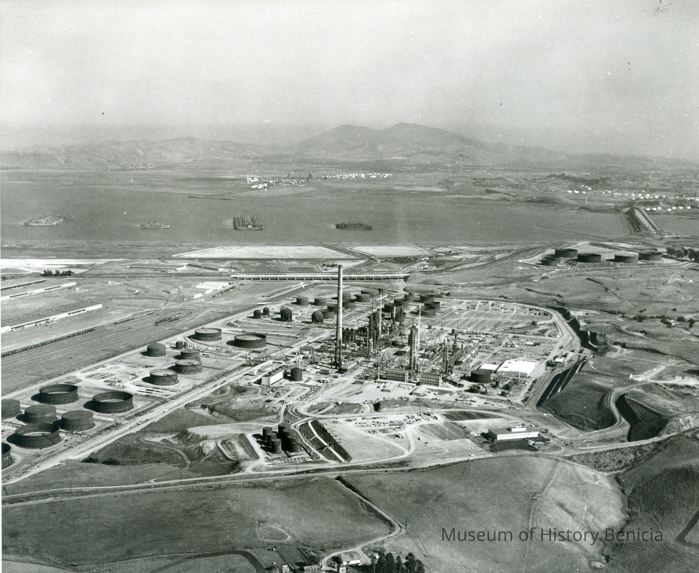 looking east: across top: Suisun Reserve/Mothball Fleet (four groups of ships), small oil refinery (Contra Costa County), Mt. Diablo, Shell Oil Refinery, SP Railroad and Benicia/Martinez bridges; across center: warehouses, railroad cars on sidings, storage tanks, refining equipment, tall smoke stack (in center), hiway 680, empty land, more storage tanks; across bottom: East Second Street, Administration building, empty fields; at center bottom: small farmCollection
