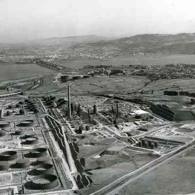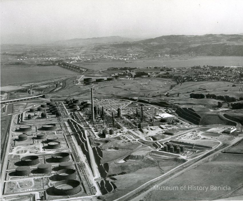 looking south east: across top: Shell Oil Refinery, SP Railroad and Benicia/Martinez bridges, City of Martinez, Contra Costa County hills; across just above center: hiway 680, small group of storage tanks, lower/southern section of Industrial Park, residential area City of Benicia; across lower portion: storage tanks, refining equipment area (large smoke stack in center) small towers, other support structures, parked vehicles, terraced hillside, administration building on East Second Street.Collection
