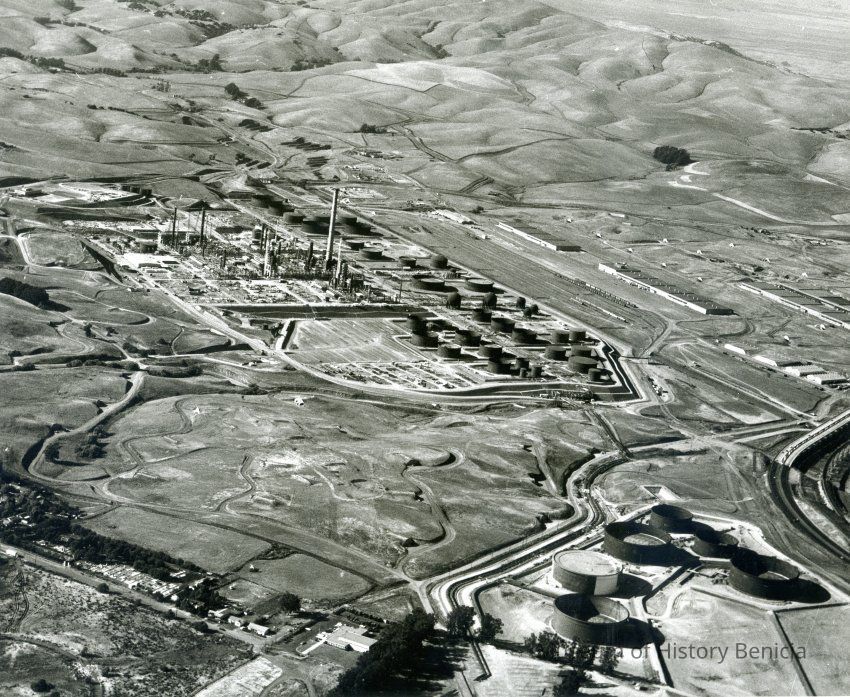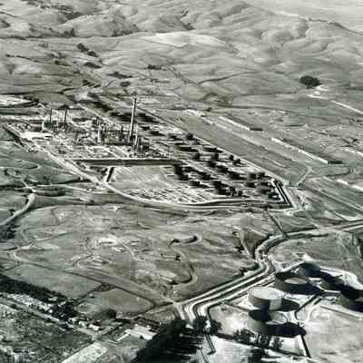 looking north west: across top: empty hills dotted with trees, access roads; across center: administration building on East Second Street, refining area, tall smoke stack (in center), storage tanks, a few railroad cars on sidings, warehouses, storage buildings, in-ground bunkers, curve of hiway 680; across bottom: future housing site (Casa Grande), homes on Hillcrest Avenue, St. Dominic's cemetery, National Guard Armory, rows of trees, small group of storage tanks.Collection
