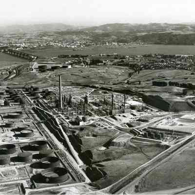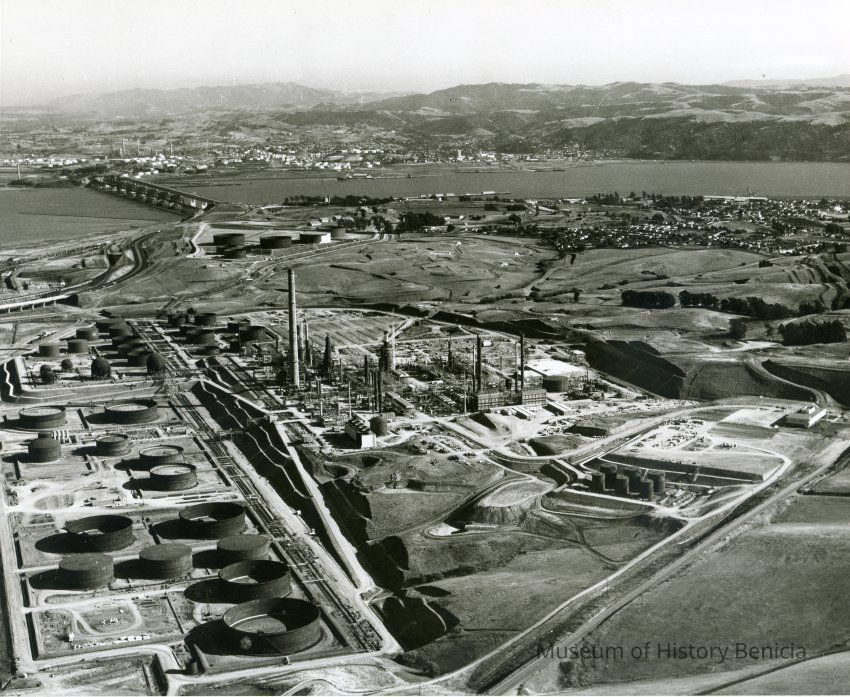looking south east: across top: Shell Oil Refinery, SP Railroad and Benicia/Martinez bridges, City of Martinez, Contra Costa Hills; across just above center: hiway 680, small group of storage tanks, southern area Industrial Park, in-ground bunkers w/access roads, east side residential (Highlands), City of Benicia, Yuba complex is at far right; across center: storage tanks, refining area (towers, pipelines, support structures) tall smoke stack, cranes, administration buildings on East Second Street.Collection
