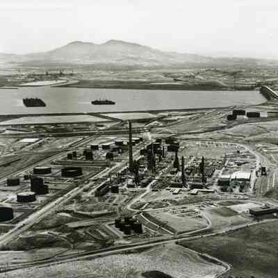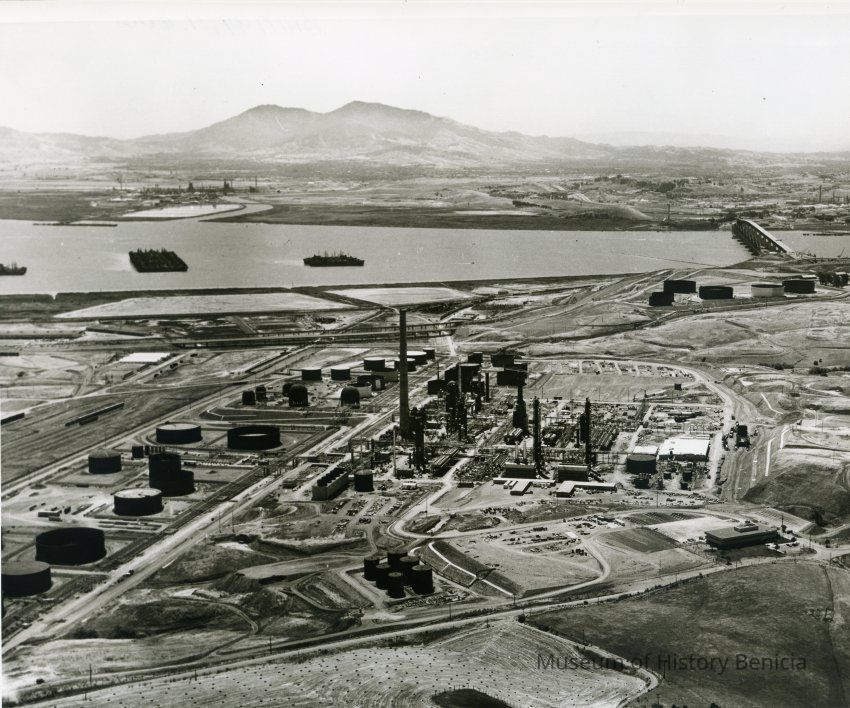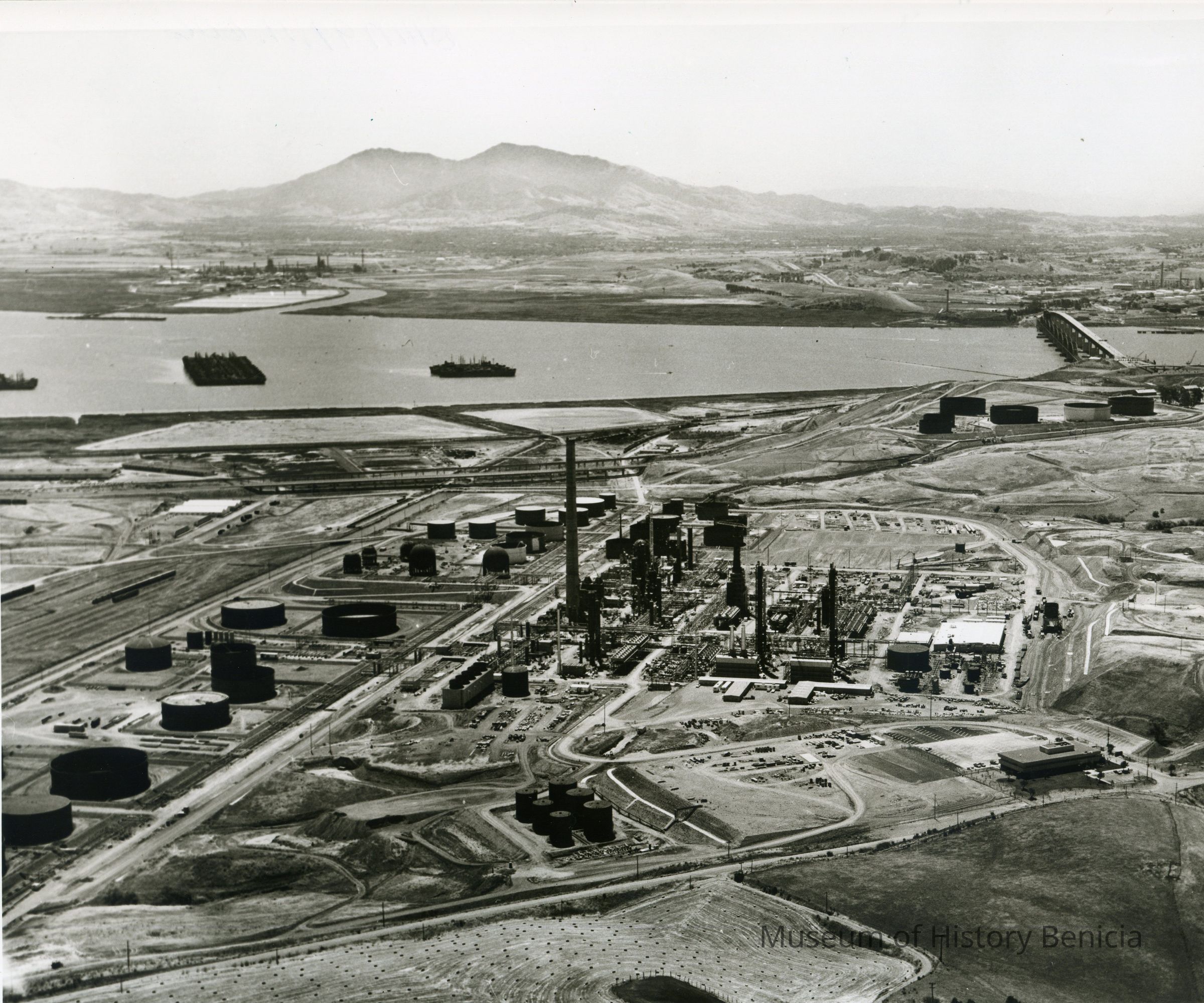 B/W aerial photo construction of Humble Oil Refinery (later Exxon and Valero) looking east: across top: Contra Costa County, small refinery, Mt. Diablo, SP Railroad and Benicia/Martinez bridges; across just above center: Suisun Reserve/Mothball Fleet (three groups of ships), marshes, small group of storage tanks; across center: hiway 680, a few railroad cars on sidings, storage tanks, refining equipment (pipes, towers, support structures, tall smoke stack), small buildings, vehicles, terraced hillside; across bottom: East Second Street, bales of grain in field, parked vehicles, administration building.Collection