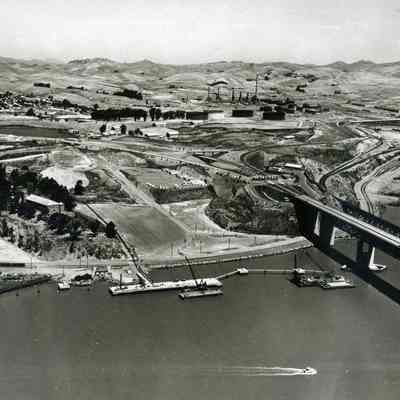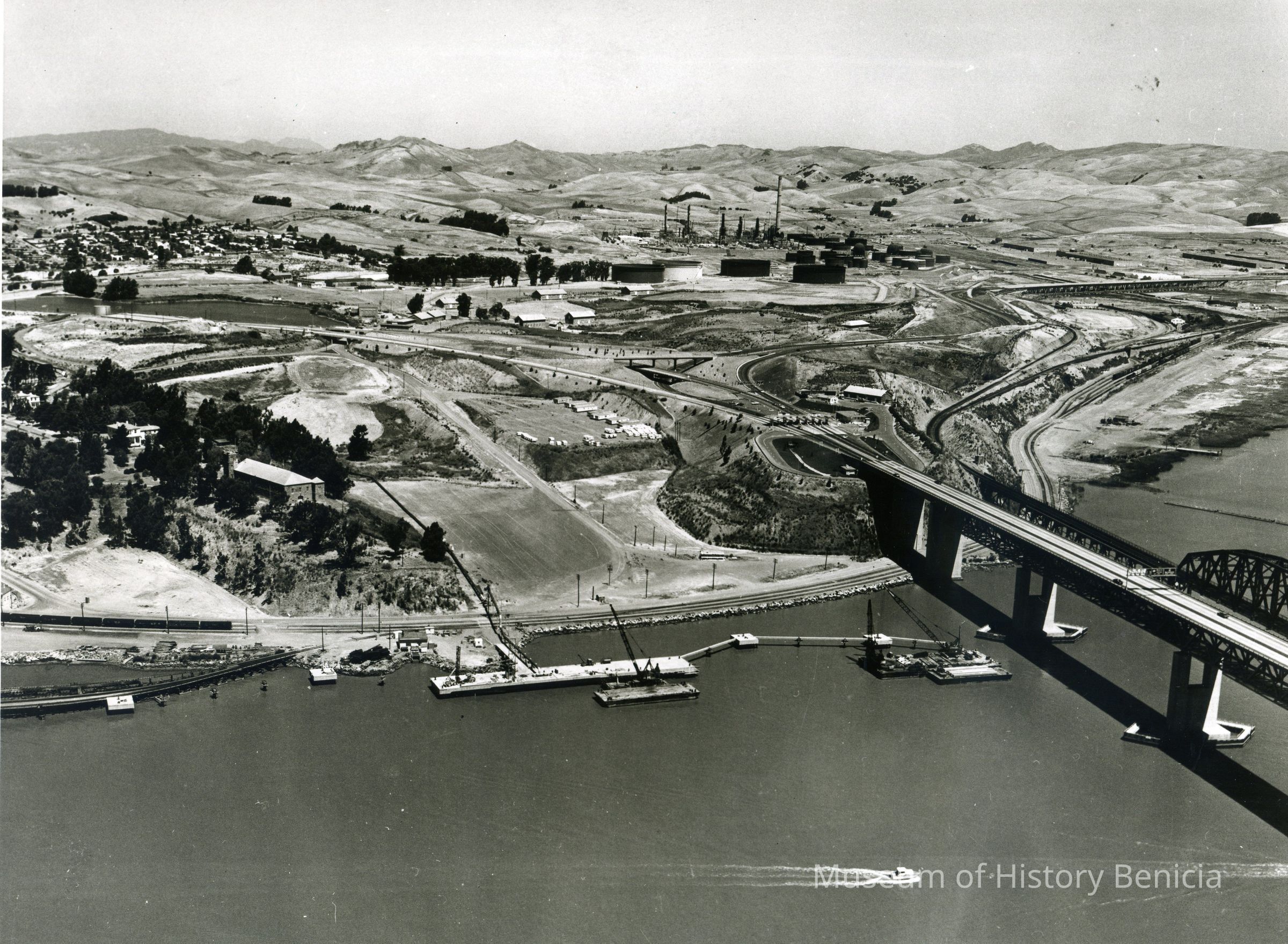 B/W aerial photo nearly complete dock/pier project; focus is on dock with cranes on barges; other features: Clock Tower, Camel Barn complex, Benicia/Martinez and SP Railroad bridges, hiway 680 and 780 interchange and toll plaza, refinery construction, City of Benicia residential area, empty hills; small pleasure craft on water in foreground.