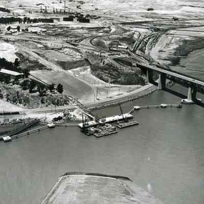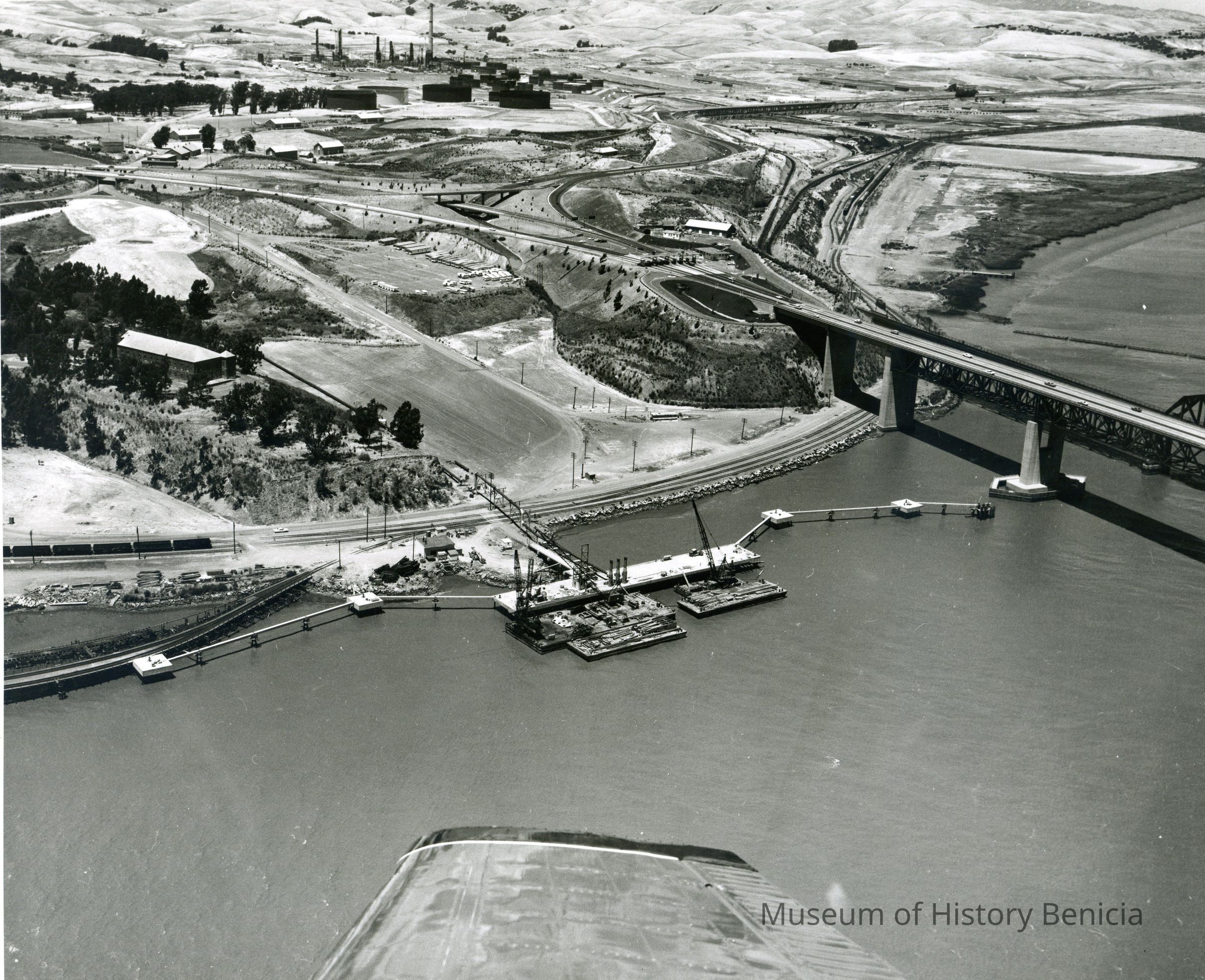 B/W aerial photo construction of nearly complete dock/pier site Healy Tibbitts Construction Company; focus is on dock with barges next to it, mooring sites appear to be complete; other features: Clock Tower, Benicia/Martinez and SP Railroad bridges, toll plaza, hiway 680 - 780 interchange, a number of historical Arsenal buildings, refinery construction appears at top center; an airplane wing tip is visible at bottom center.Collection