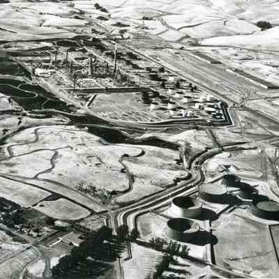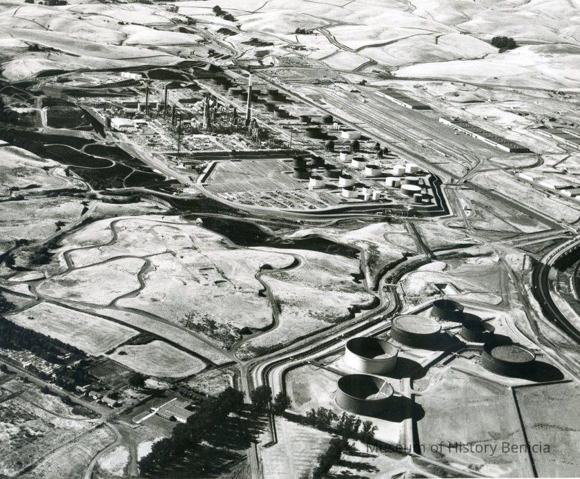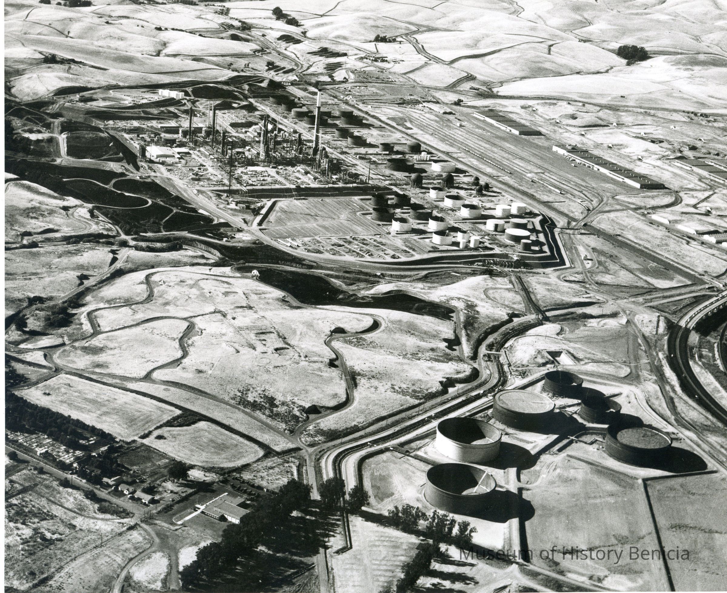 B/W aerial photo construction Humble Oil Refinery (later Exxon and Valero) looking north west: across bottom: St. Dominic's Cemetery, homes on Hillcrest Avenue, National Guard Armory, storage tanks, curve hiway 680; across just below center: in-ground bunker area; across above center: empty, dark field, refining equipment area, storage tanks, railroad sidings, storage/warehouses; across top: empty, rolling hills.Collection