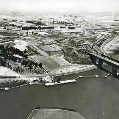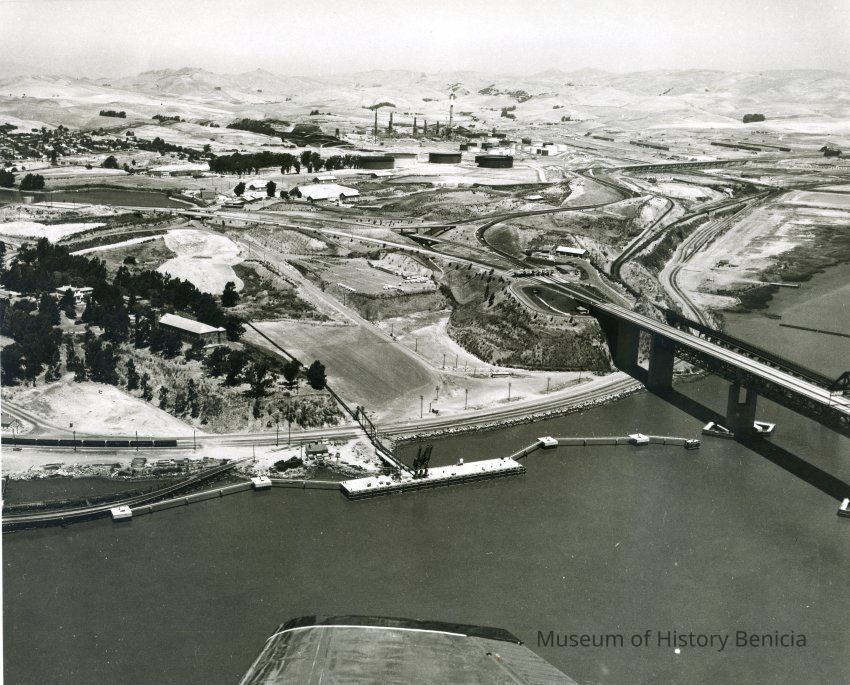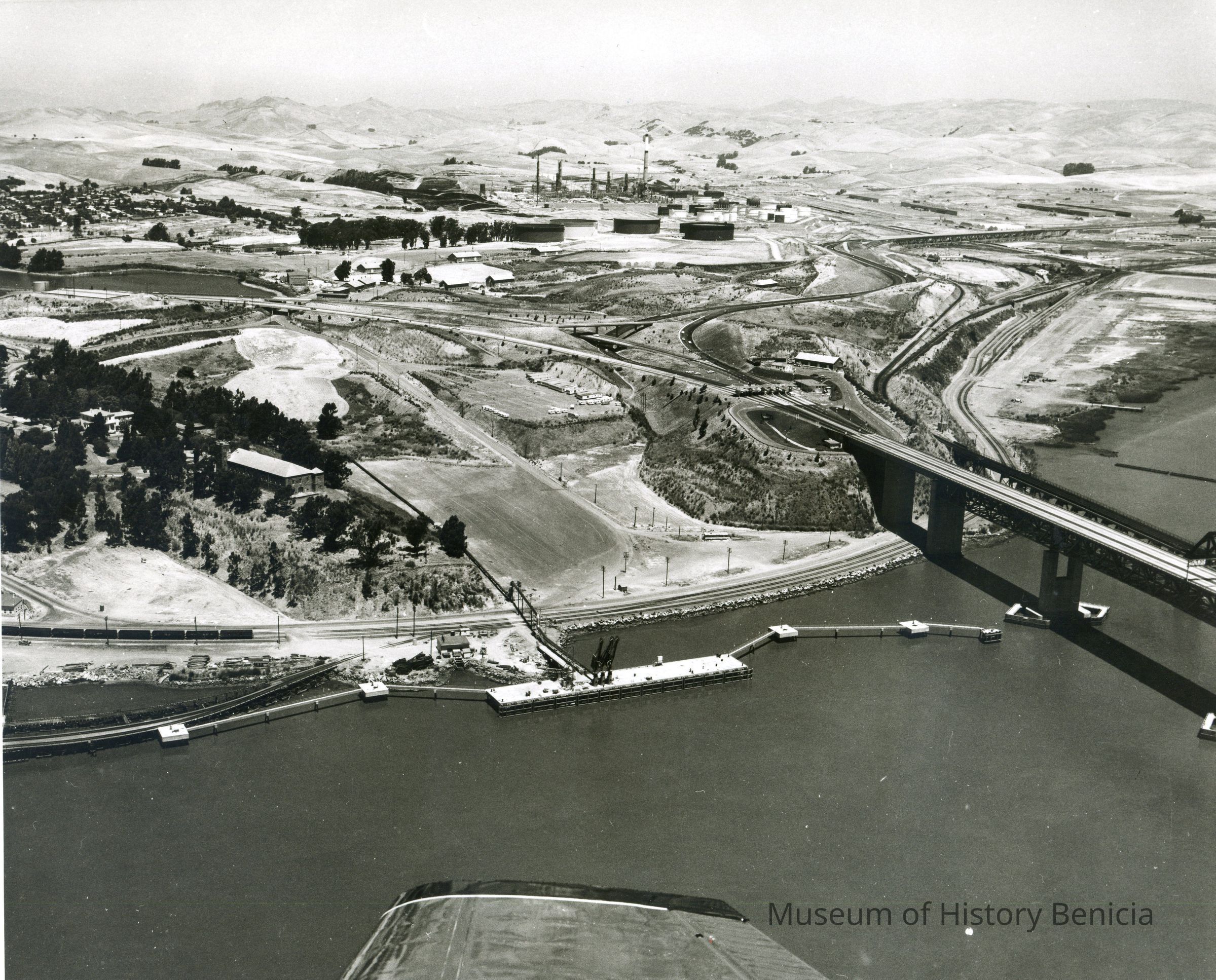 B/W aerial photo dock/pier site south of Benicia/Martinez bridge on Carquinez Strait shoreline, looking north east: across top: Benicia residences, empty hills, oil refinery, hiway 680; across center: hiway 780, Clock Tower, toll plaza, Benicia/Martinez and SP Railroad bridges; across bottom: railroad tracks along rocky shoreline, completed dock/pier and mooring stations, airplane wing tip.