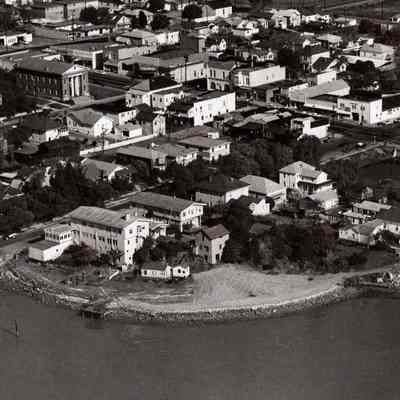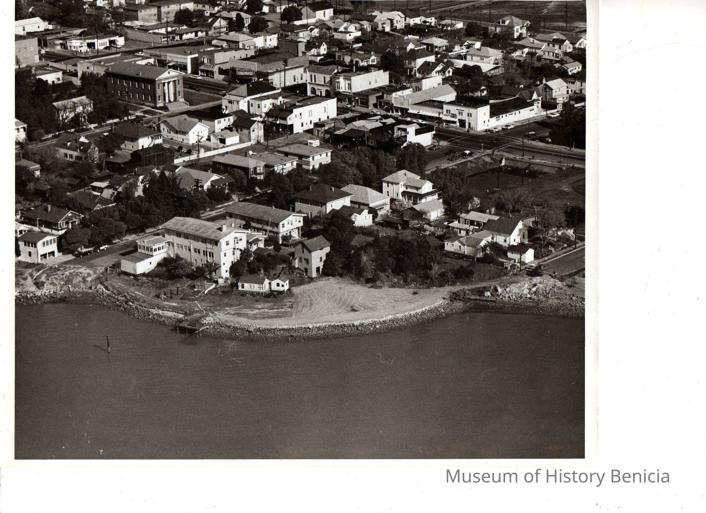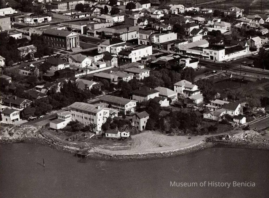 B/W aerial photo, envelope identified as "Dr. W. Coon Property", shows Benicia shoreline in vicinity of the Anderson Hotel, "Pink Palace", between the end of West F Street and West E Street; many buildings along First Street are visible south of H Street to E Street. Many empty lots are also visible.Collection