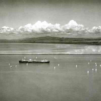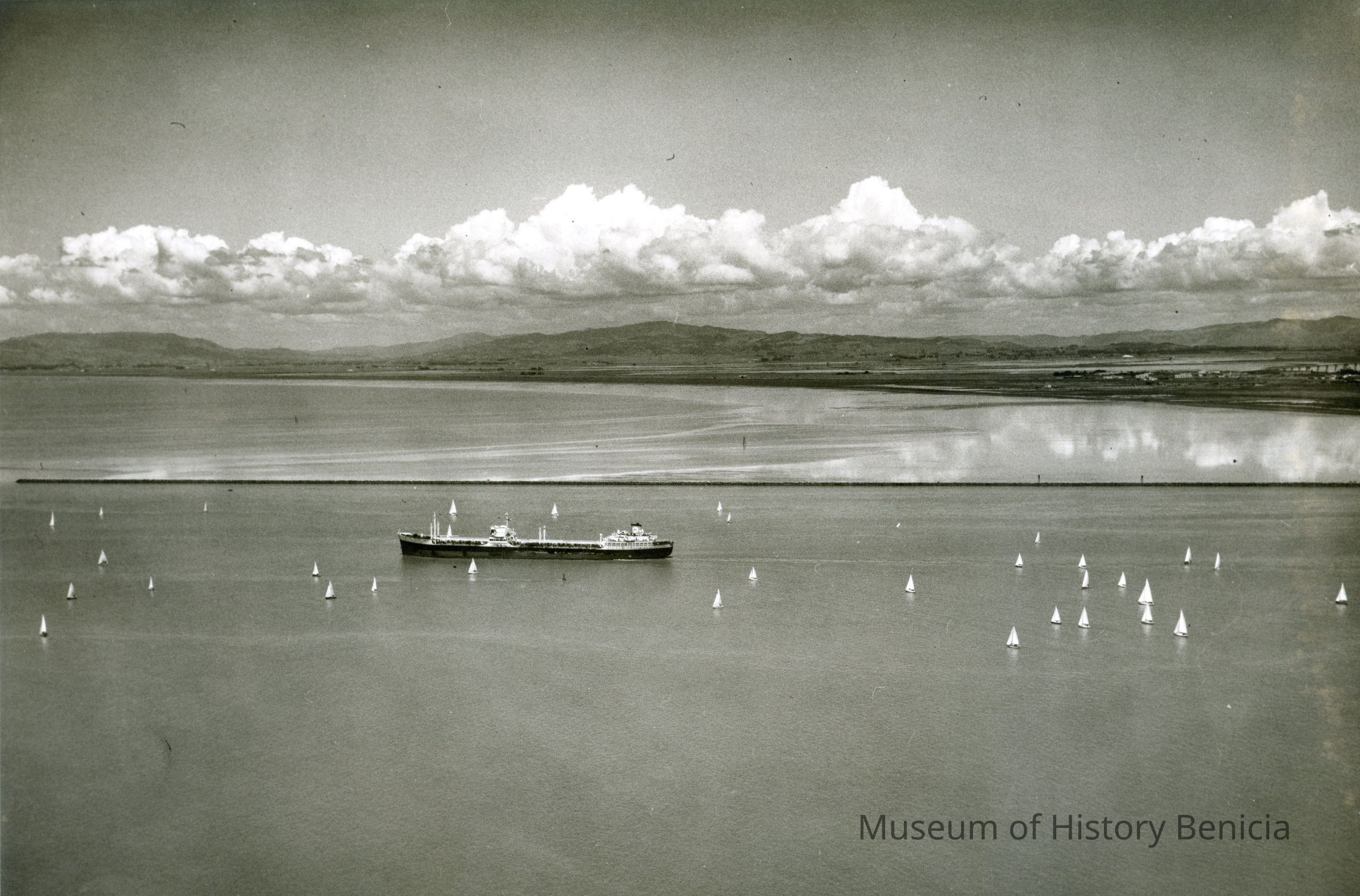 B/W aerial photo, envelope identified as "Annual Sail Regatta, Vallejo"; shows over 30 small sail boats in water near a large tanker-type ship; empty hills and cloudy sky in the background.Collection