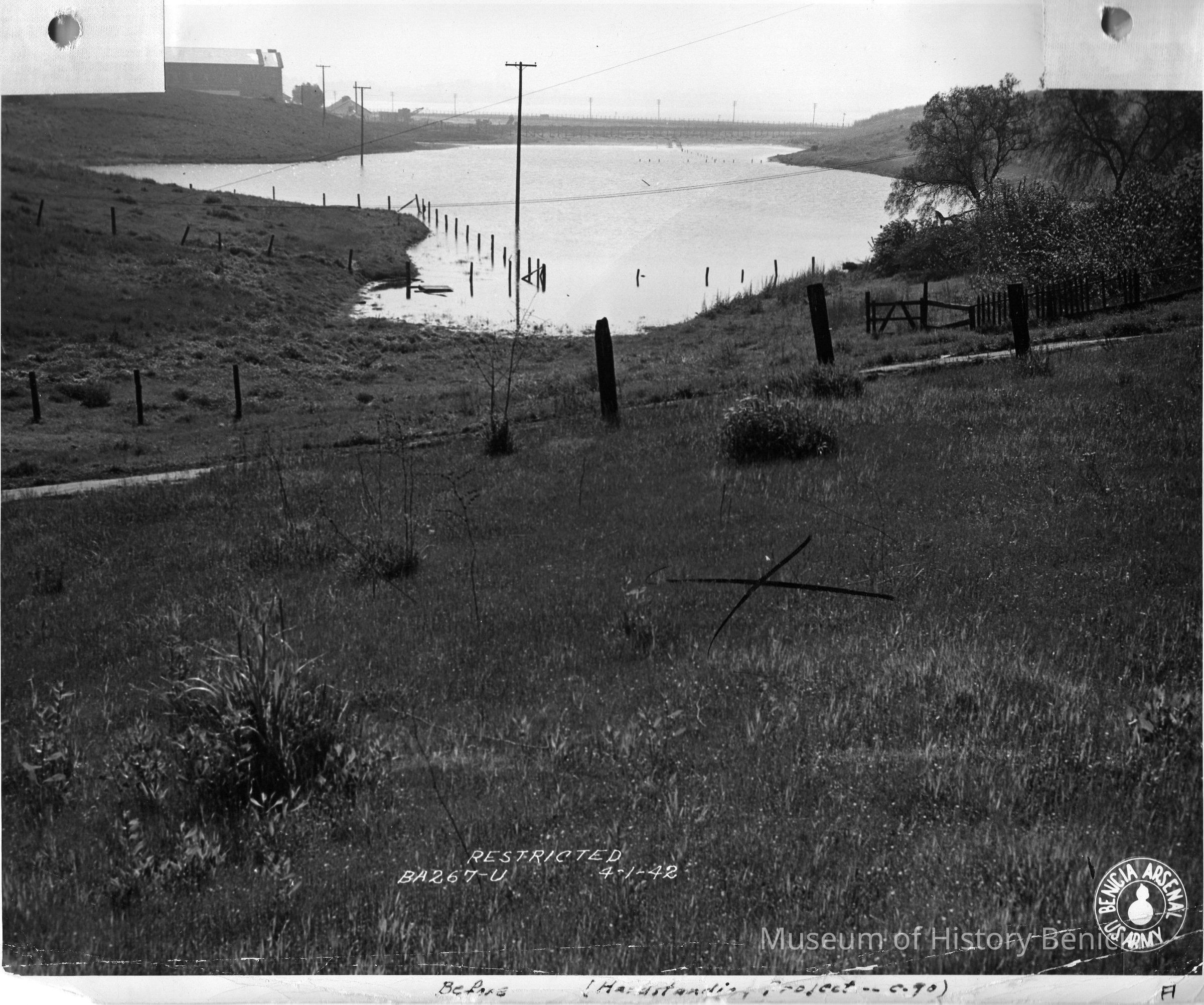 B/w Benicia Arsenal, open field and small lake. Image was restricted.
