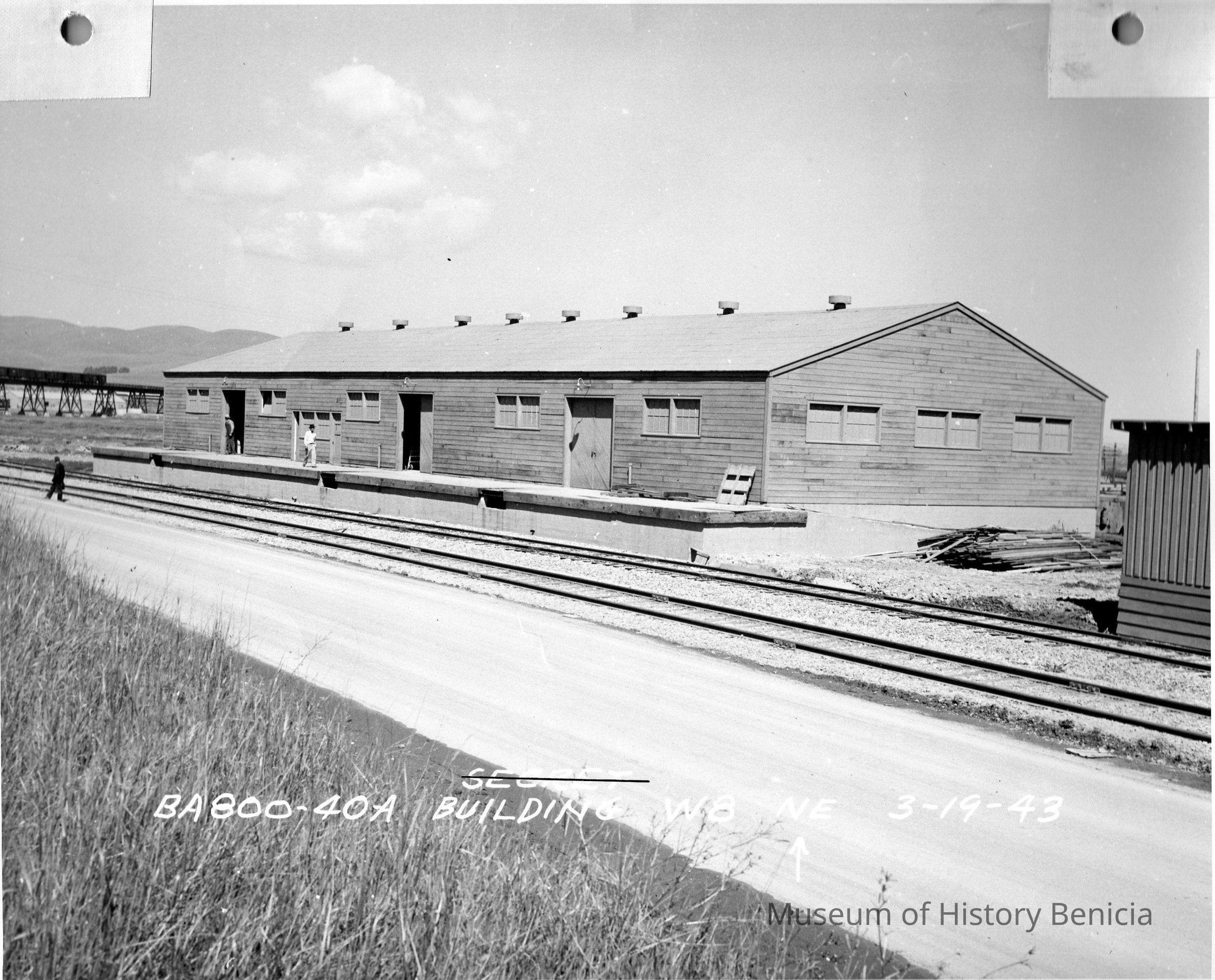 B/w Benicia Arsenal, Bldg W-8- gas cylinder storehouse, facing northeast.