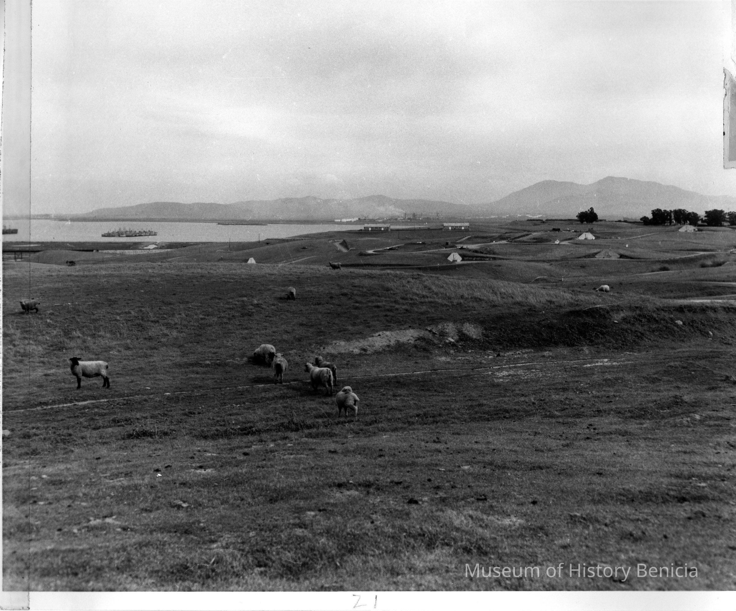 B/w Benicia Arsenal, sheep grazing in open field. Underground bunkers can be seen in the background as well as the Carquinez Straits and Mt. Diablo.Collection