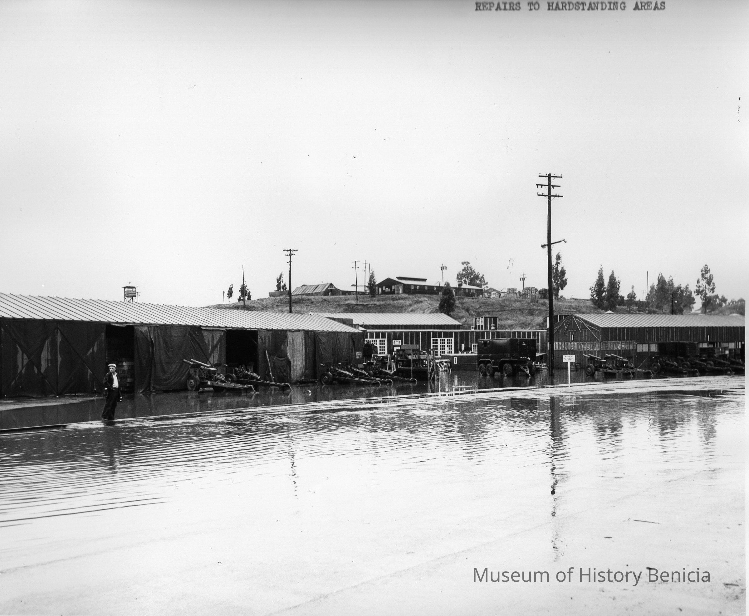 B/w Benicia Arsenal, repairs in the hardstanding areas . Shows Flooding in B.A.