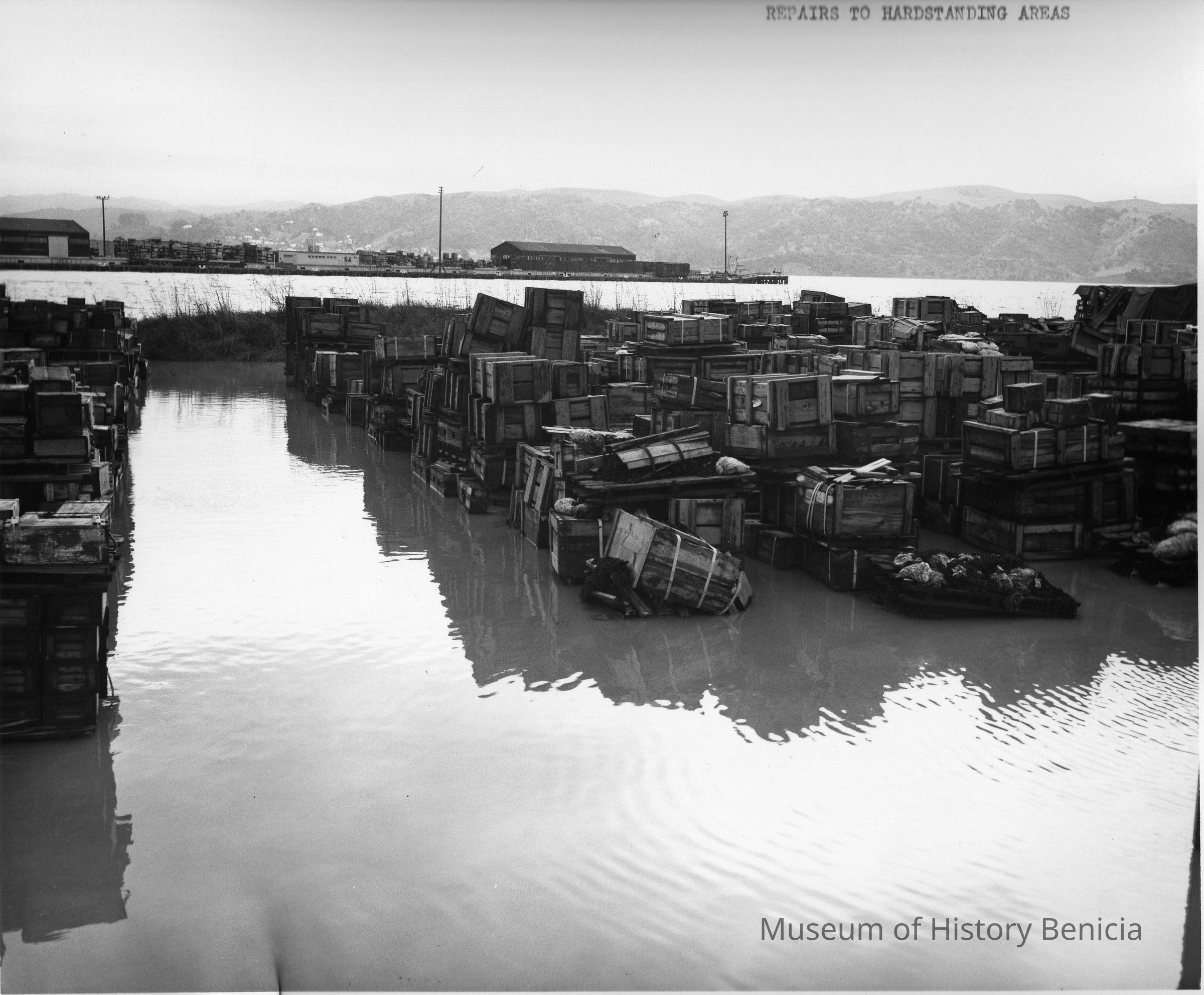 B/w Benicia Arsenal, repairs in the hardstanding areas after flood. Shows Flooding in B.A.