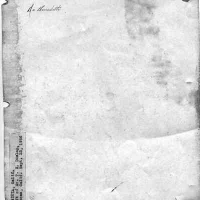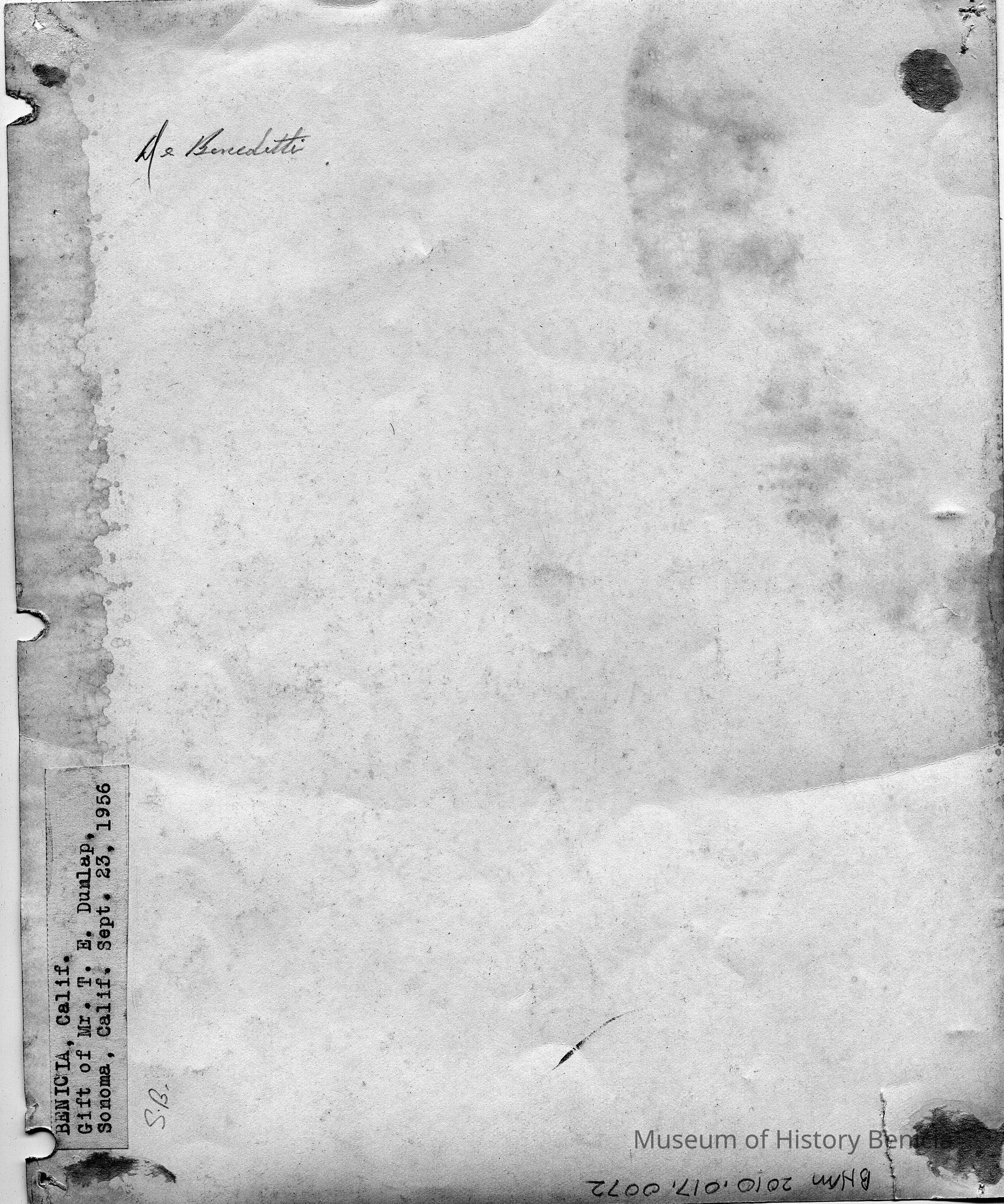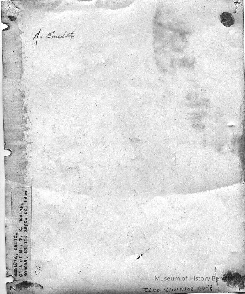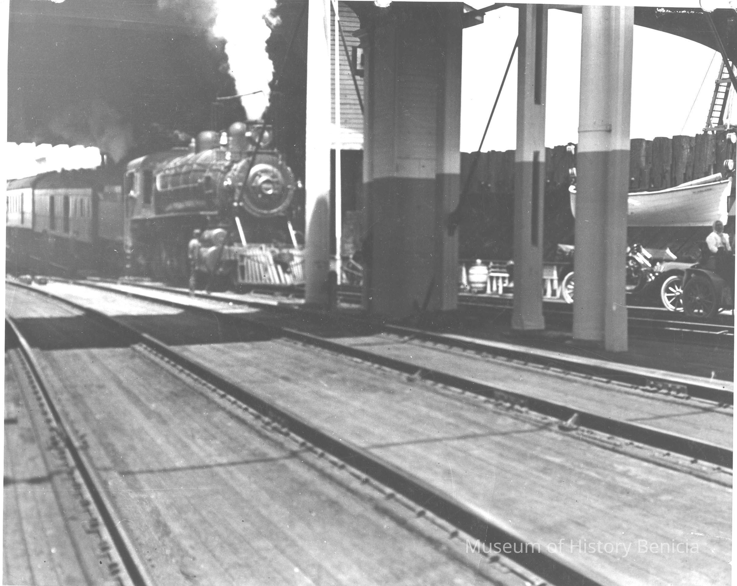 Photo on paper of steam locomotive with a car in the background. On the back is a sticker that says :