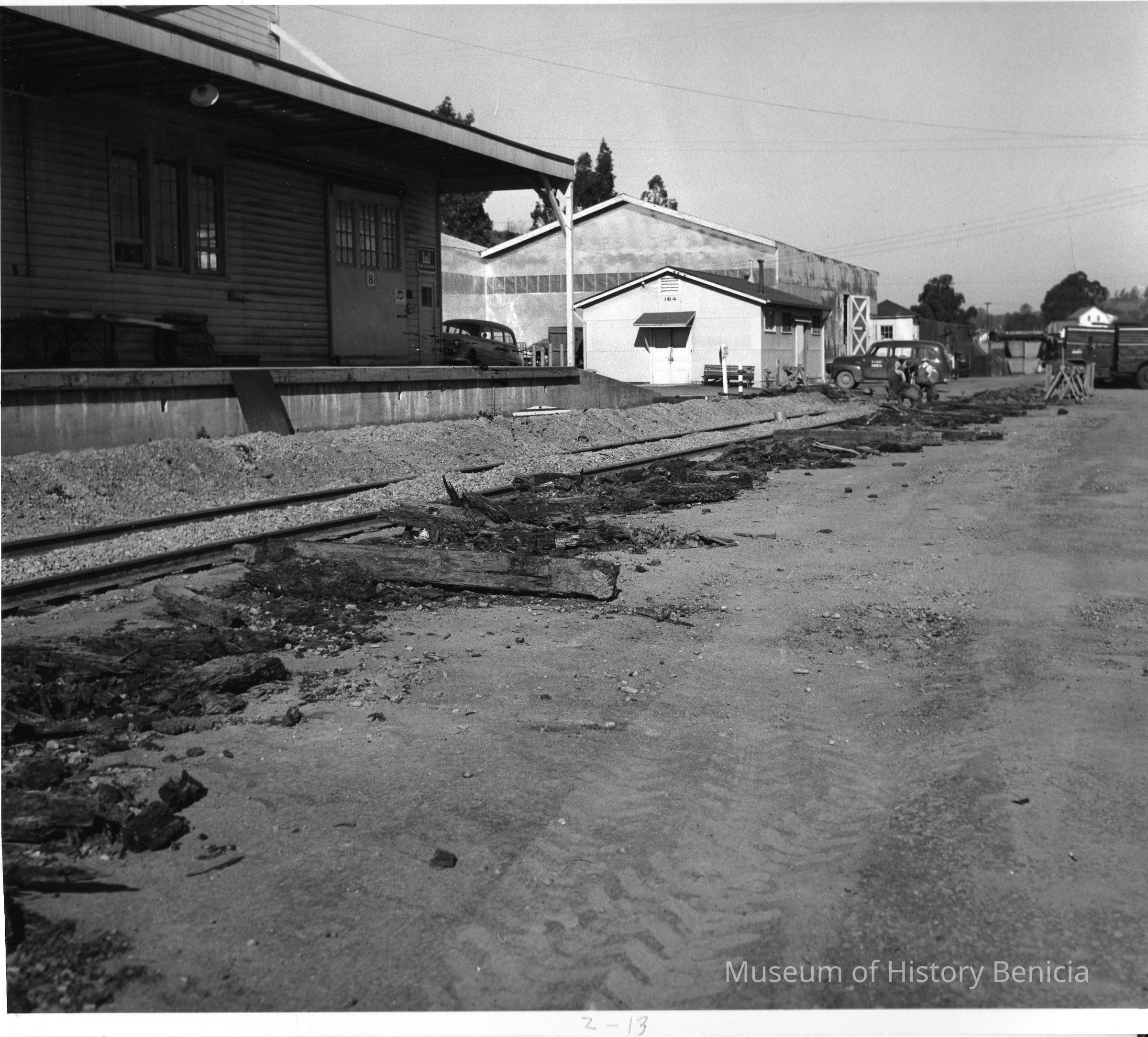 B/w Benicia Arsenal, Z-13 wooden ties destroyed, Bldgs 8 and 164 in background.
