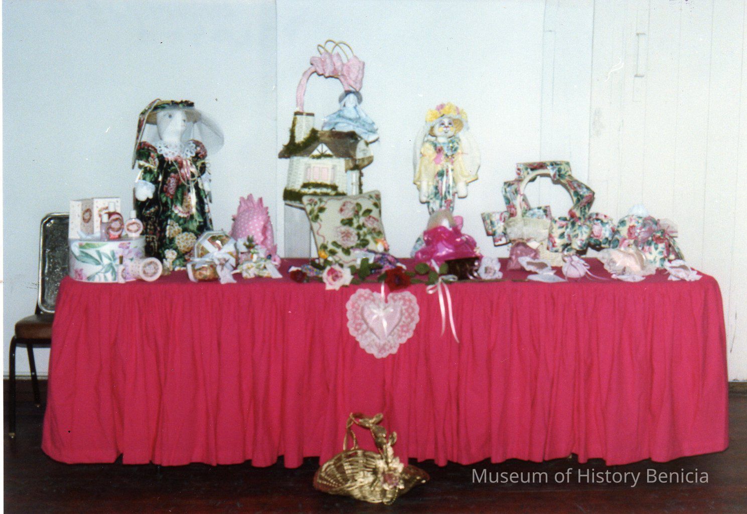 color photo of a table with a reddish table cloth covered with many objects: boxes, dolls, baskets (prizes?)Collection