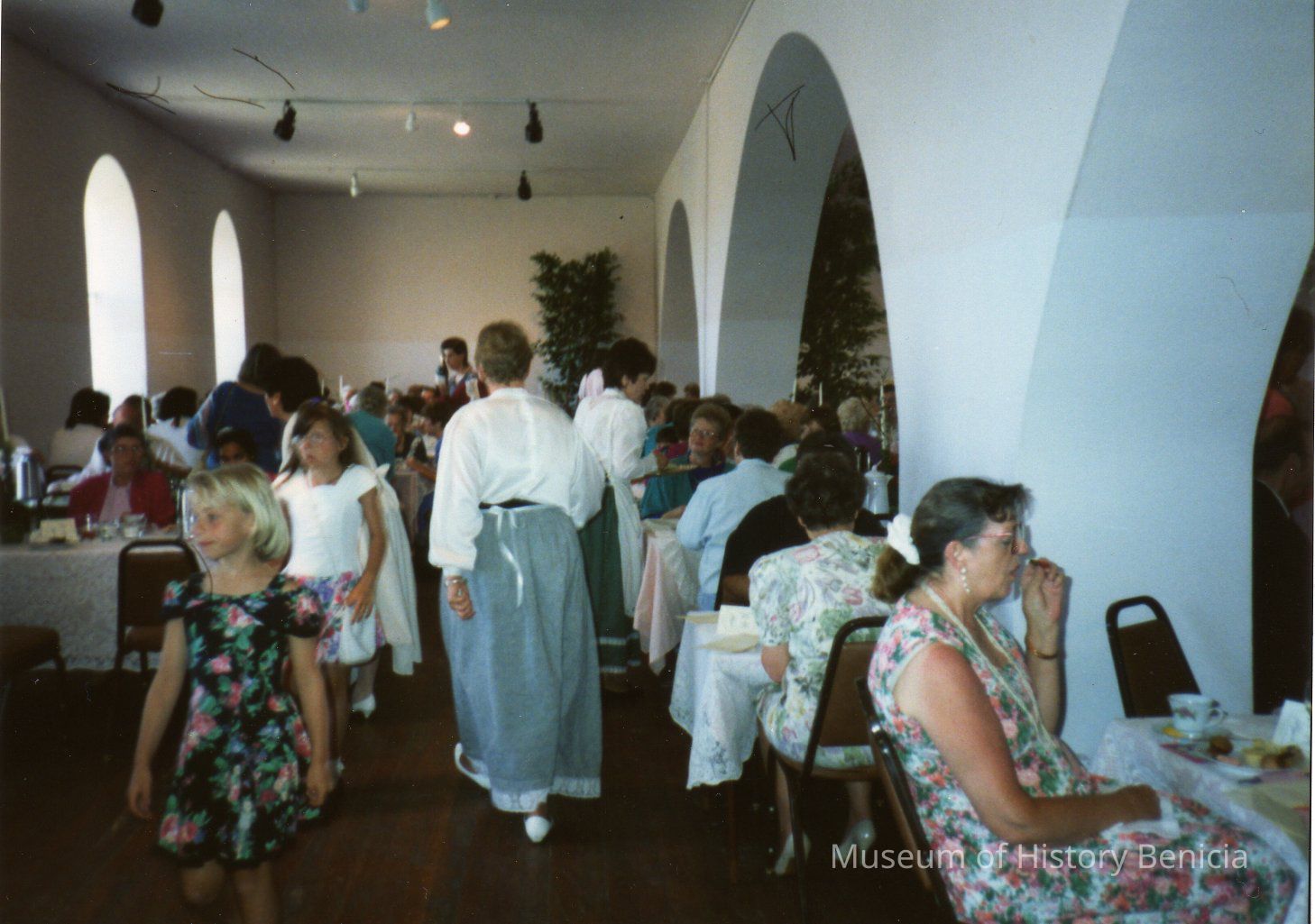 Mother's Day Tea 1992 Fundraiser color photo of the attendees sitting and walking in Stone Hall