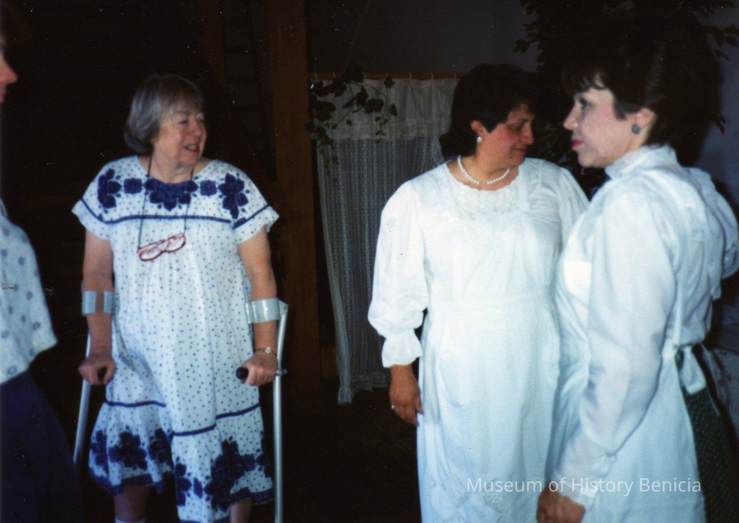 color photo of three standing women, one unidentified on left with crutches, in center Darlene Anderson, on right Bev Phelan (per back of photo)Collection