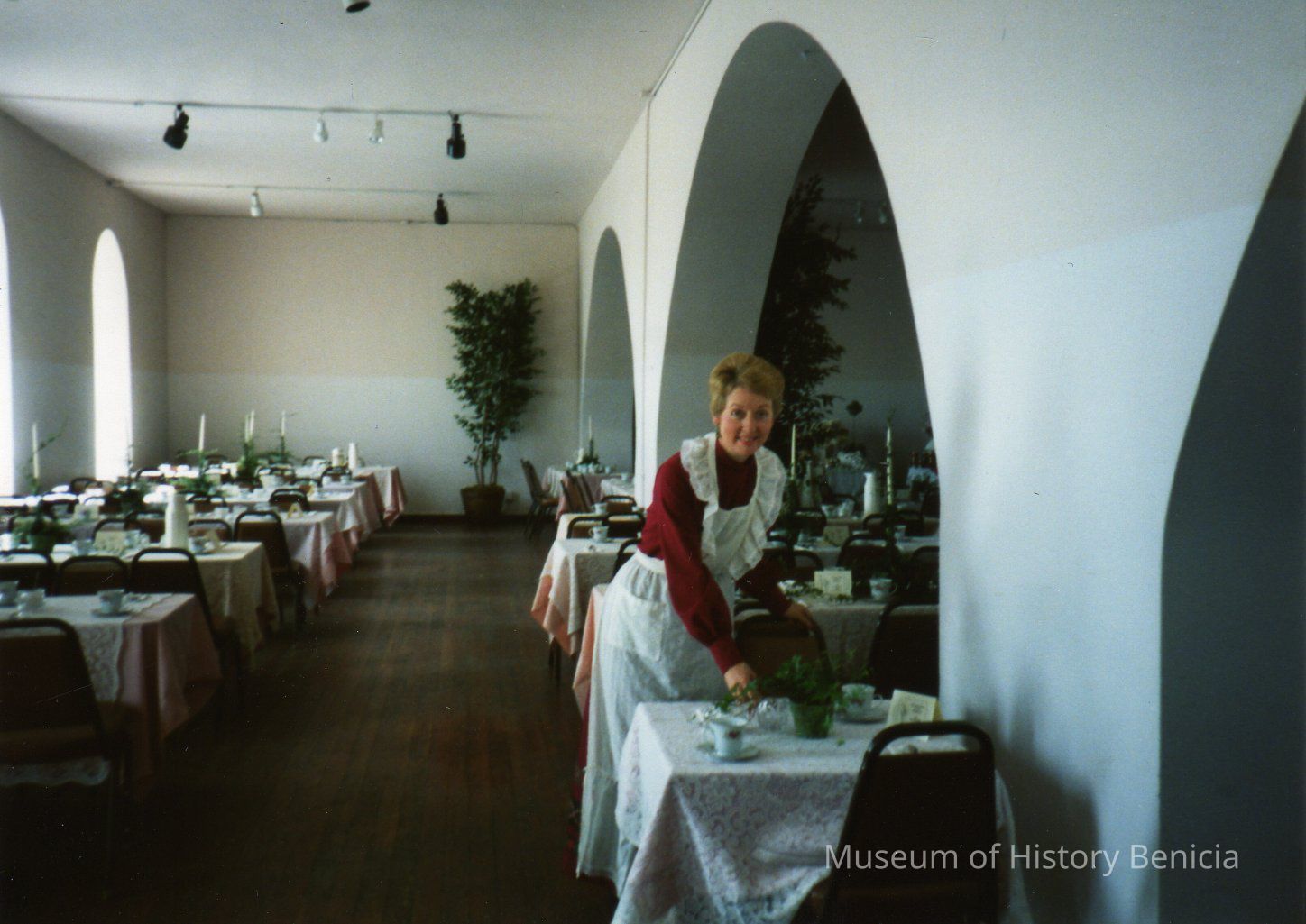 color photo of Kate McNamara (per back of photo) arranging a table prior to the start of the teaCollection
